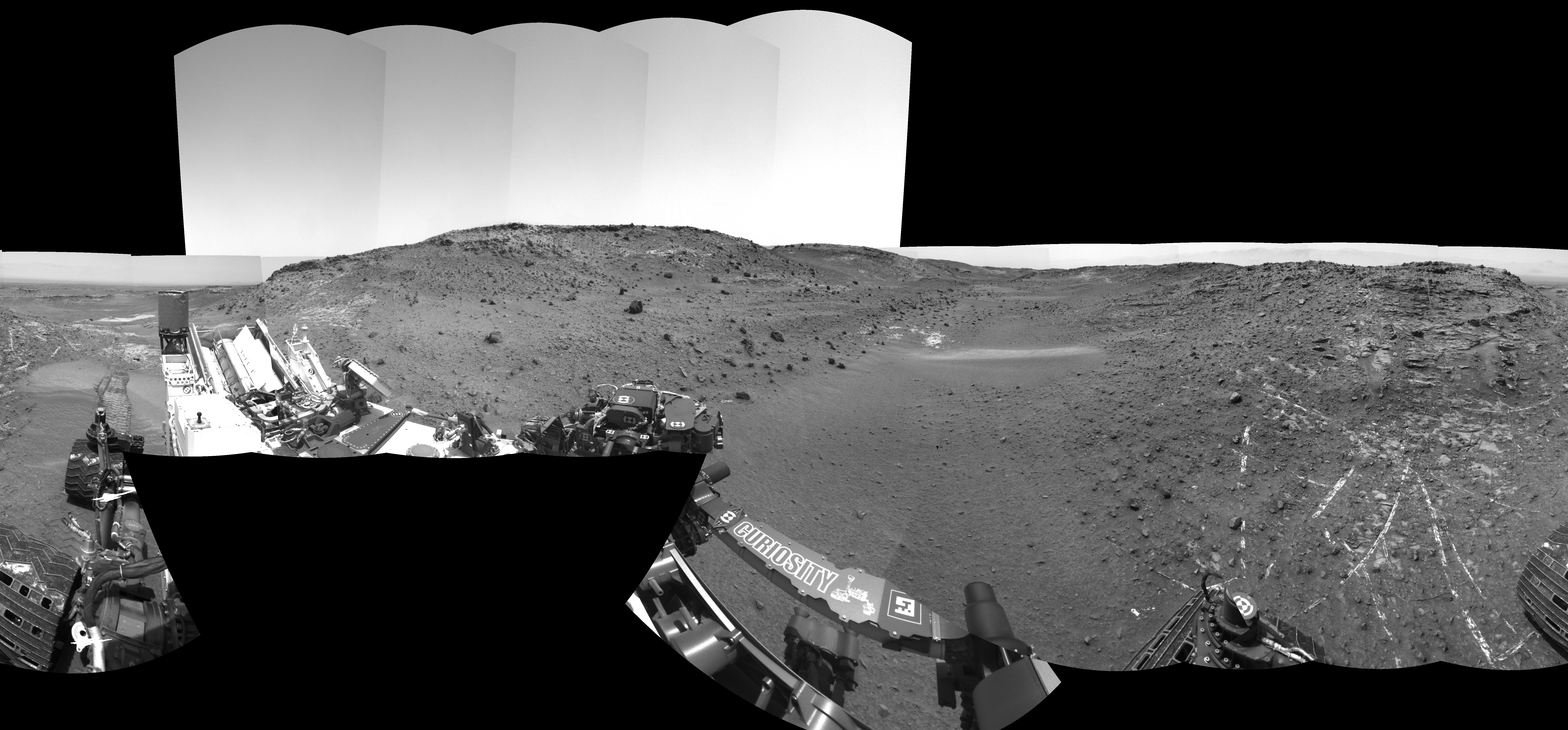 NASA's Mars rover Curiosity took 23 images in Gale Crater using its mast-mounted Left Navigation Camera (Navcam) to create this mosaic. The seam-corrected mosaic provides a 360-degree cylindrical-perspective projection panorama of the Martian surface suitable for stereo viewing, centered at 328 degrees azimuth (measured clockwise from north). This single-eye view must be combined with the partner right image to be viewed in stereo. Curiosity took the images on April 08, 2015, Sol 949 of the Mars Science Laboratory mission at drive 1276, site number 45. The local mean solar time for the image exposures was from 1 PM to 2 PM. Each Navcam image has a 45-degree field of view. CREDIT: NASA/JPL-Caltech