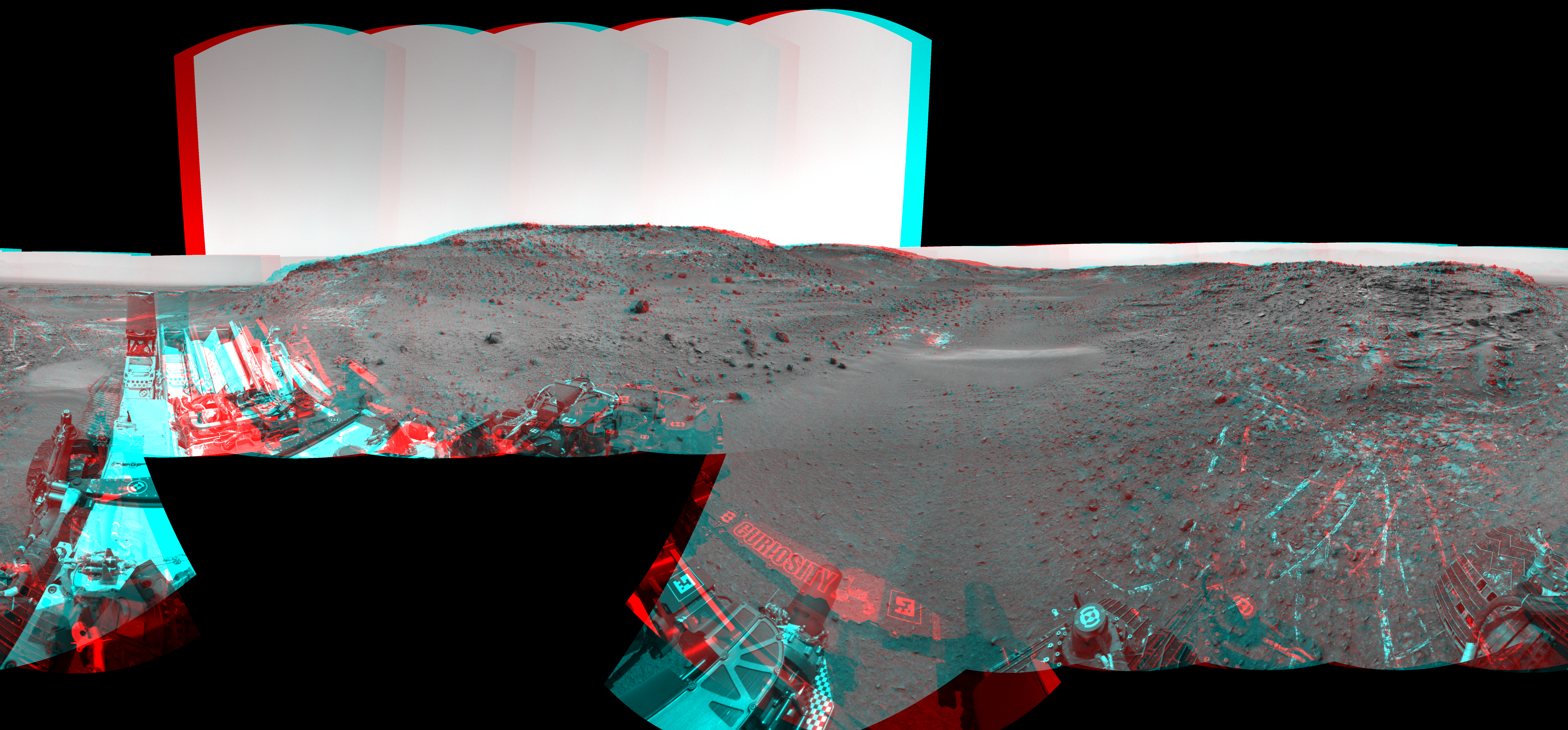 NASA's Mars rover Curiosity took 23 image pairs in Gale Crater using its mast-mounted Navigation Camera (Navcam) to create this mosaic. The seam-corrected mosaic provides a 360-degree cylindrical perspective projection panorama of the Martian surface suitable for stereo viewing, centered at 328 degrees azimuth (measured clockwise from north). This anaglyph must be viewed with red/blue glasses (red over left eye). Curiosity took the images on April 08, 2015, Sol 949 of the Mars Science Laboratory mission at drive 1276, site number 45. The local mean solar time for the image exposures was from 1 PM to 2 PM. Each Navcam image has a 45-degree field of view. CREDIT: NASA/JPL-Caltech