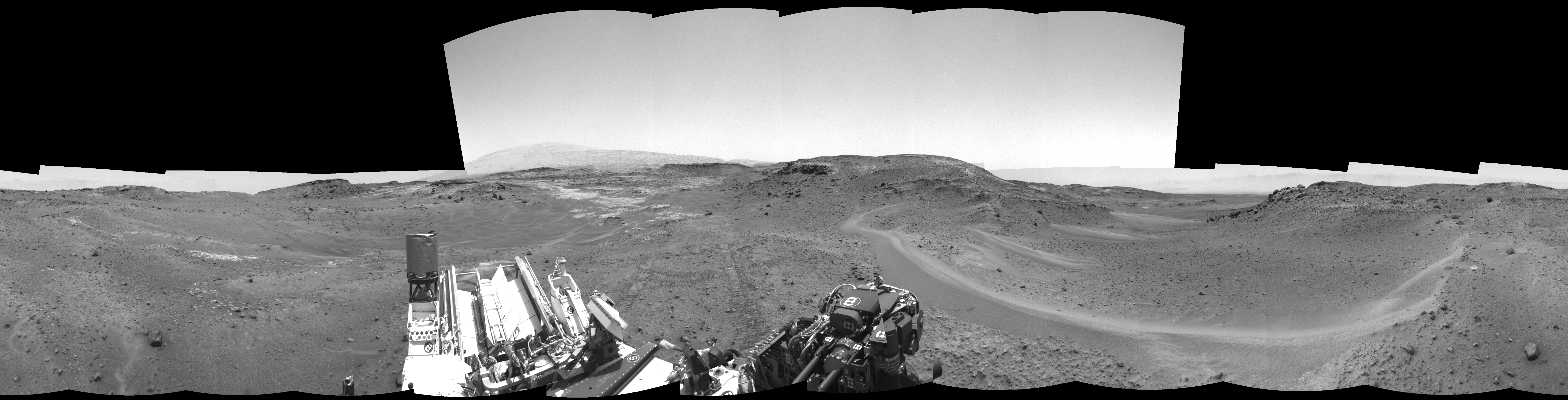 NASA's Mars rover Curiosity took 17 images in Gale Crater using its mast-mounted Right Navigation Camera (Navcam) to create this mosaic. The seam-corrected mosaic provides a 0-degree cylindrical-perspective projection panorama of the Martian surface suitable for stereo viewing, centered at 79 degrees azimuth (measured clockwise from north). This single-eye view must be combined with the partner left image to be viewed in stereo. Curiosity took the images on April 15, 2015, Sol 956 of the Mars Science Laboratory mission at drive 472, site number 46. The local mean solar time for the image exposures was 1 PM. Each Navcam image has a 45-degree field of view. CREDIT: NASA/JPL-Caltech