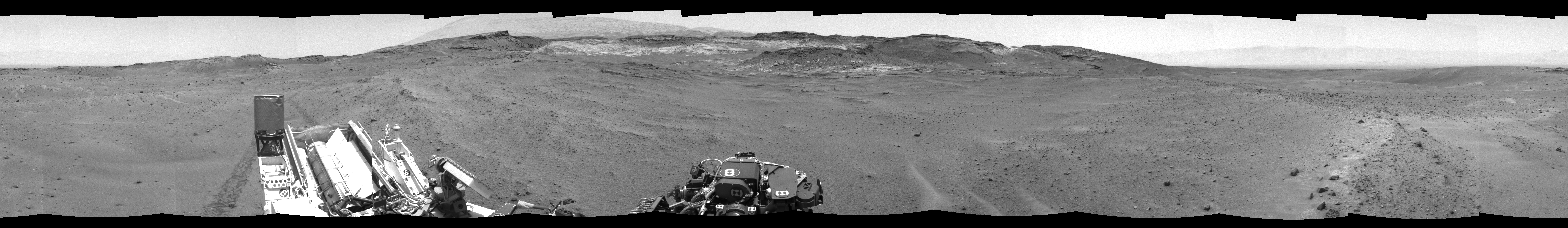 NASA's Mars rover Curiosity took 12 images in Gale Crater using its mast-mounted Left Navigation Camera (Navcam) to create this mosaic. The seam-corrected mosaic provides a 360-degree cylindrical-perspective projection panorama of the Martian surface suitable for stereo viewing, centered at 307 degrees azimuth (measured clockwise from north). This single-eye view must be combined with the partner right image to be viewed in stereo. Curiosity took the images on April 23, 2015, Sol 963 of the Mars Science Laboratory mission at drive 1812, site number 46. The local mean solar time for the image exposures was 1 PM. Each Navcam image has a 45-degree field of view. CREDIT: NASA/JPL-Caltech