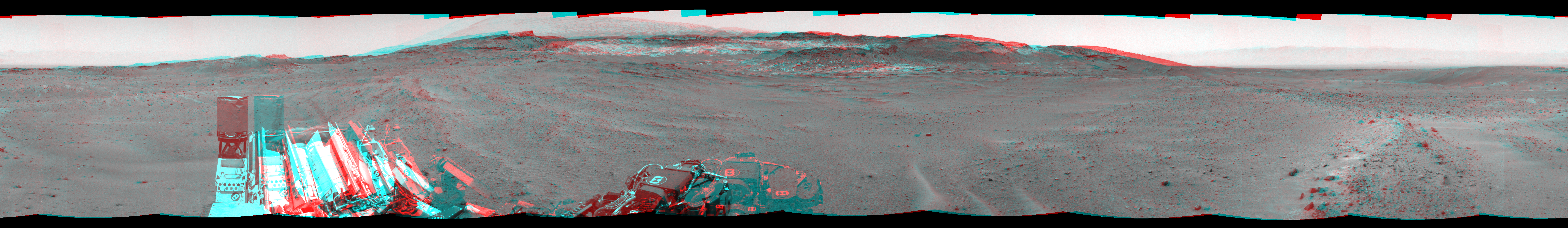 NASA's Mars rover Curiosity took 12 image pairs in Gale Crater using its mast-mounted Navigation Camera (Navcam) to create this mosaic. The seam-corrected mosaic provides a 360-degree cylindrical perspective projection panorama of the Martian surface suitable for stereo viewing, centered at 307 degrees azimuth (measured clockwise from north). This anaglyph must be viewed with red/blue glasses (red over left eye). Curiosity took the images on April 23, 2015, Sol 963 of the Mars Science Laboratory mission at drive 1812, site number 46. The local mean solar time for the image exposures was 1 PM. Each Navcam image has a 45-degree field of view. CREDIT: NASA/JPL-Caltech