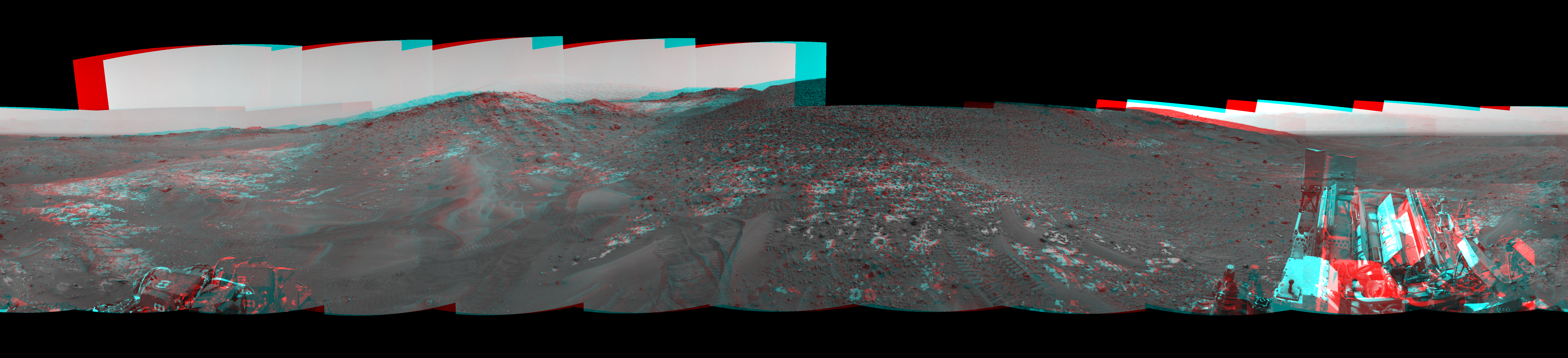 NASA's Mars rover Curiosity took 17 image pairs in Gale Crater using its mast-mounted Navigation Camera (Navcam) to create this mosaic. The seam-corrected mosaic provides a 360-degree cylindrical perspective projection panorama of the Martian surface suitable for stereo viewing, centered at 60 degrees azimuth (measured clockwise from north). This anaglyph must be viewed with red/blue glasses (red over left eye). Curiosity took the images on May 17, 2015, Sol 987 of the Mars Science Laboratory mission at drive 458, site number 48. The local mean solar time for the image exposures was 3 PM. Each Navcam image has a 45-degree field of view. CREDIT: NASA/JPL-Caltech