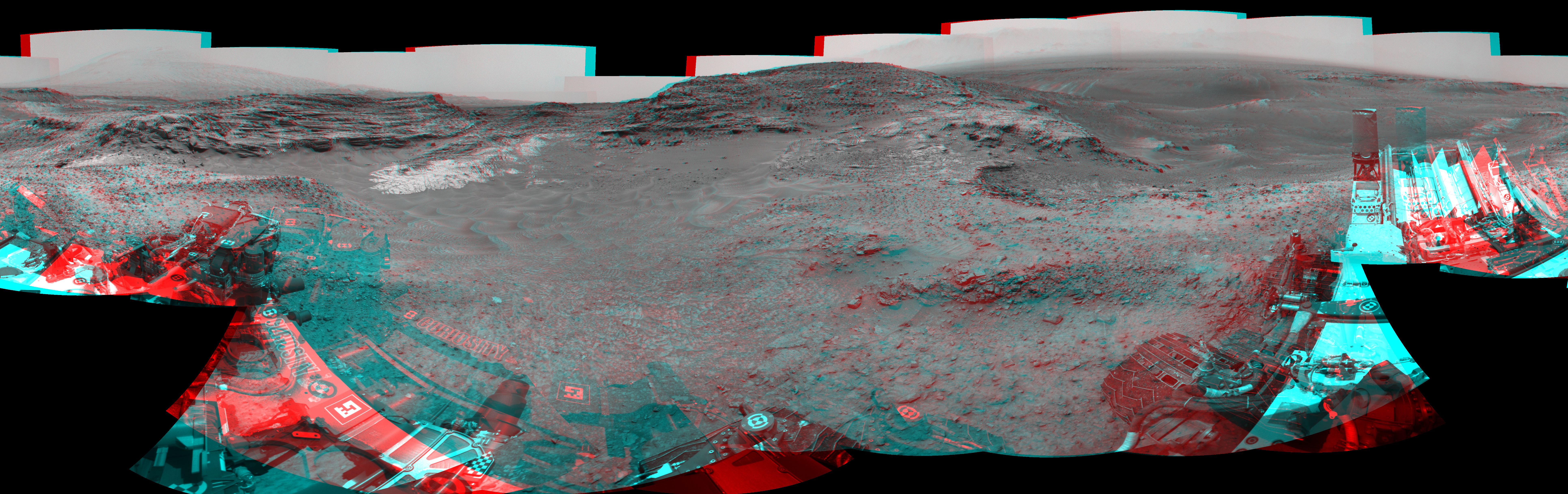 NASA's Mars rover Curiosity took 24 image pairs in Gale Crater using its mast-mounted Navigation Camera (Navcam) to create this mosaic. The seam-corrected mosaic provides a 360-degree cylindrical perspective projection panorama of the Martian surface suitable for stereo viewing, centered at 45 degrees azimuth (measured clockwise from north). This anaglyph must be viewed with red/blue glasses (red over left eye). Curiosity took the images on May 22, 2015, Sol 992 of the Mars Science Laboratory mission at drive 1194, site number 48. The local mean solar time for the image exposures was from 1 PM to 2 PM. Each Navcam image has a 45-degree field of view. CREDIT: NASA/JPL-Caltech