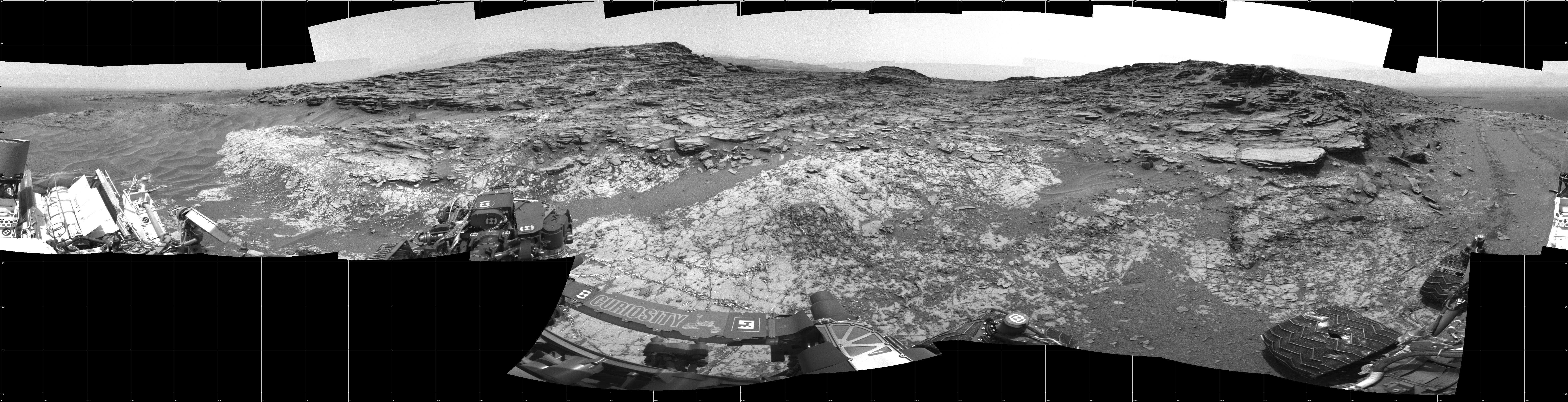 NASA's Mars rover Curiosity took 27 images in Gale Crater using its mast-mounted Left Navigation Camera (Navcam) to create this mosaic. The seam-corrected mosaic provides a 360-degree cylindrical projection panorama of the Martian surface centered at 180 degrees azimuth (measured clockwise from north). Curiosity took the images on May 26, 2015, Sol 995 of the Mars Science Laboratory mission at drive 1530, site number 48. The local mean solar time for the image exposures was 2 PM. Each Navcam image has a 45 degree field of view. CREDIT: NASA/JPL-Caltech
