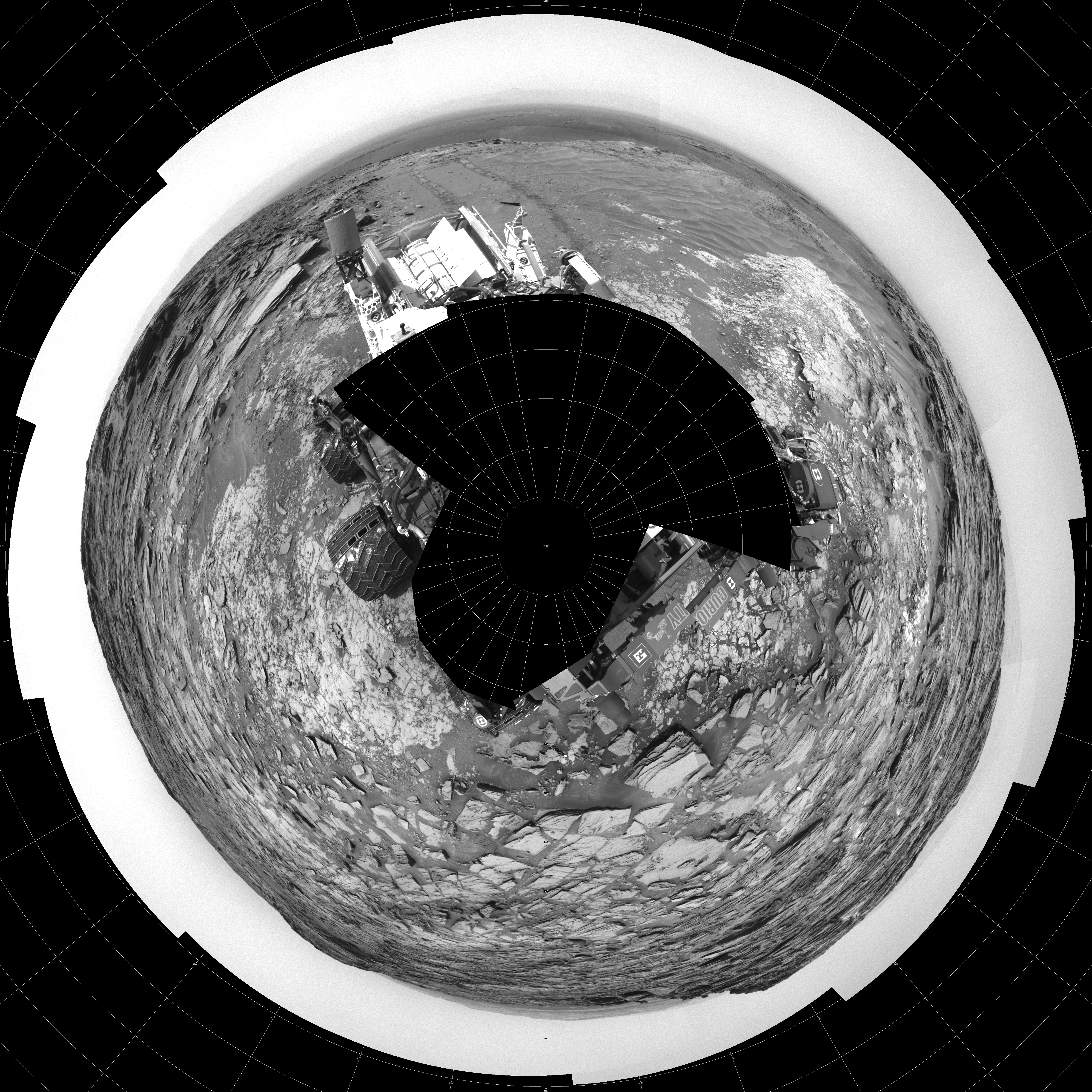 NASA's Mars rover Curiosity took 31 images in Gale Crater using its mast-mounted Left Navigation Camera (Navcam) to create this mosaic. The seam-corrected mosaic provides a polar stereographic projection panorama of the Martian surface with 0 degrees azimuth (measured clockwise from north) at the top of the image. Curiosity took the images on May 28, 2015, Sol 997 of the Mars Science Laboratory mission at drive 1570, site number 48. The local mean solar time for the image exposures was 2 PM. Each Navcam image has a 45-degree field of view. CREDIT: NASA/JPL-Caltech