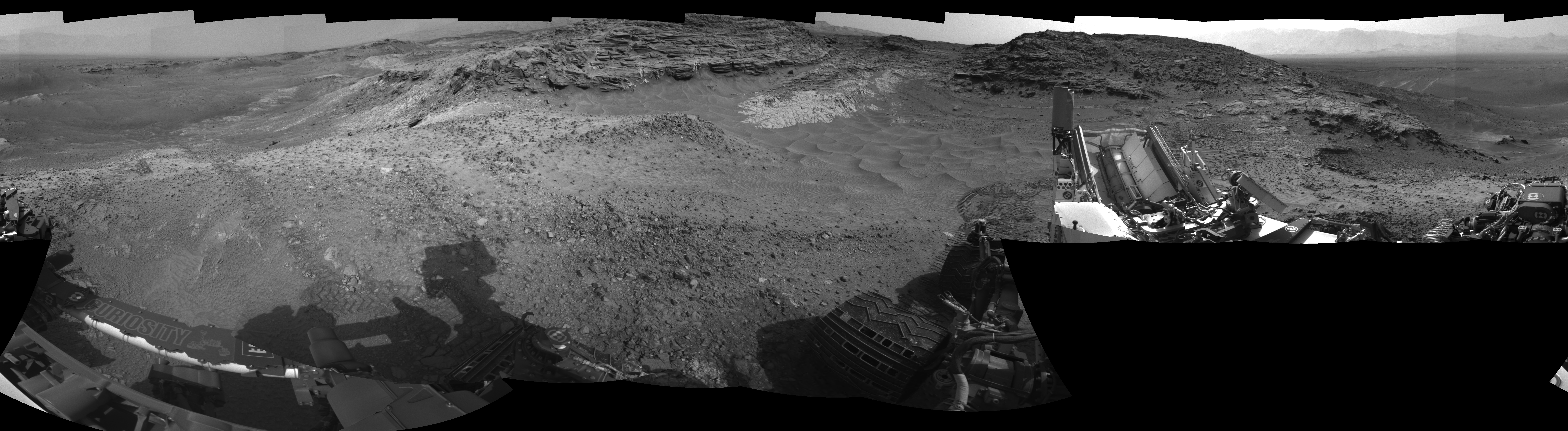 NASA's Mars rover Curiosity took 19 images in Gale Crater using its mast-mounted Left Navigation Camera (Navcam) to create this mosaic. The seam-corrected mosaic provides a 360-degree cylindrical-perspective projection panorama of the Martian surface suitable for stereo viewing, centered at 123 degrees azimuth (measured clockwise from north). This single-eye view must be combined with the partner right image to be viewed in stereo. Curiosity took the images on July 06, 2015, Sol 1035 of the Mars Science Laboratory mission at drive 1906, site number 48. The local mean solar time for the image exposures was from 3 PM to 4 PM. Each Navcam image has a 45-degree field of view. CREDIT: NASA/JPL-Caltech