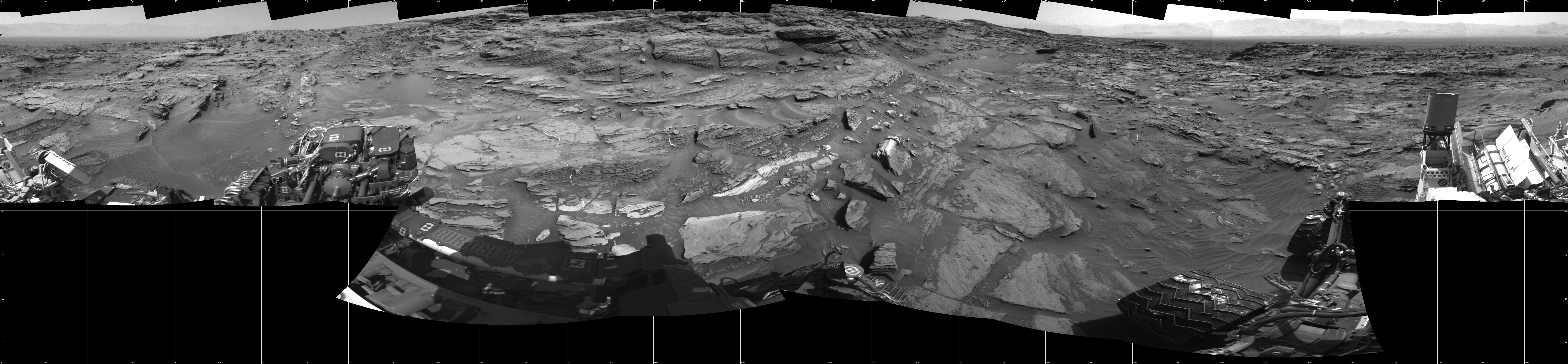 NASA's Mars rover Curiosity took 19 images in Gale Crater using its mast-mounted Left Navigation Camera (Navcam) to create this mosaic. The seam-corrected mosaic provides a 360-degree cylindrical projection panorama of the Martian surface centered at 180 degrees azimuth (measured clockwise from north). Curiosity took the images on August 28, 2015, Sol 1087 of the Mars Science Laboratory mission at drive 1876, site number 49. The local mean solar time for the image exposures was from 2 PM to 3 PM. Each Navcam image has a 45 degree field of view. CREDIT: NASA/JPL-Caltech