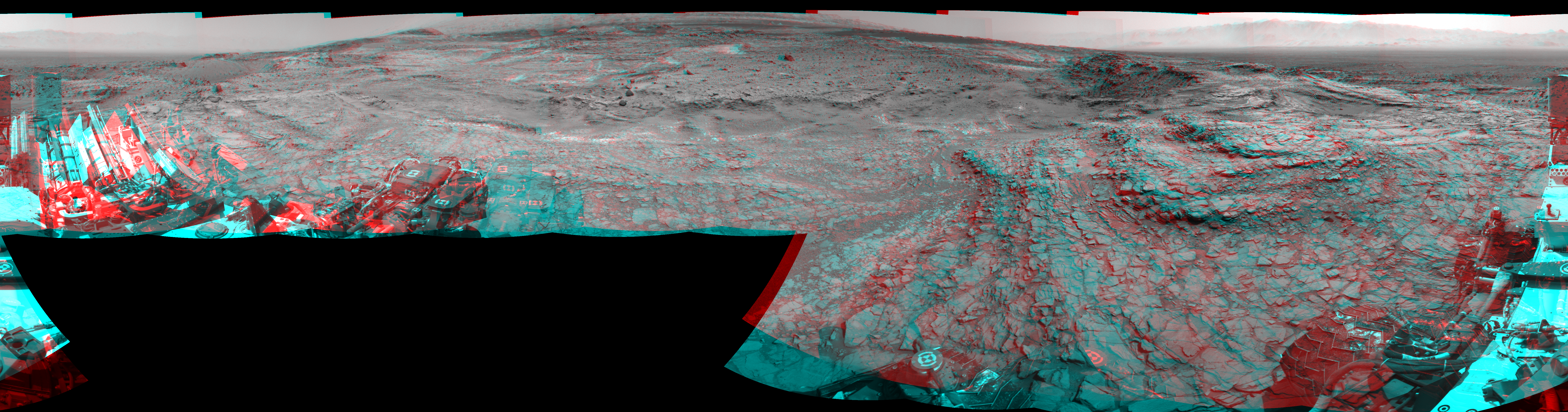 NASA's Mars rover Curiosity took 17 image pairs in Gale Crater using its mast-mounted Navigation Camera (Navcam) to create this mosaic. The seam-corrected mosaic provides a 360-degree cylindrical perspective projection panorama of the Martian surface suitable for stereo viewing, centered at 359 degrees azimuth (measured clockwise from north). This anaglyph must be viewed with red/blue glasses (red over left eye). Curiosity took the images on September 08, 2015, Sol 1098 of the Mars Science Laboratory mission at drive 2374, site number 49. The local mean solar time for the image exposures was 2 PM. Each Navcam image has a 45-degree field of view. CREDIT: NASA/JPL-Caltech