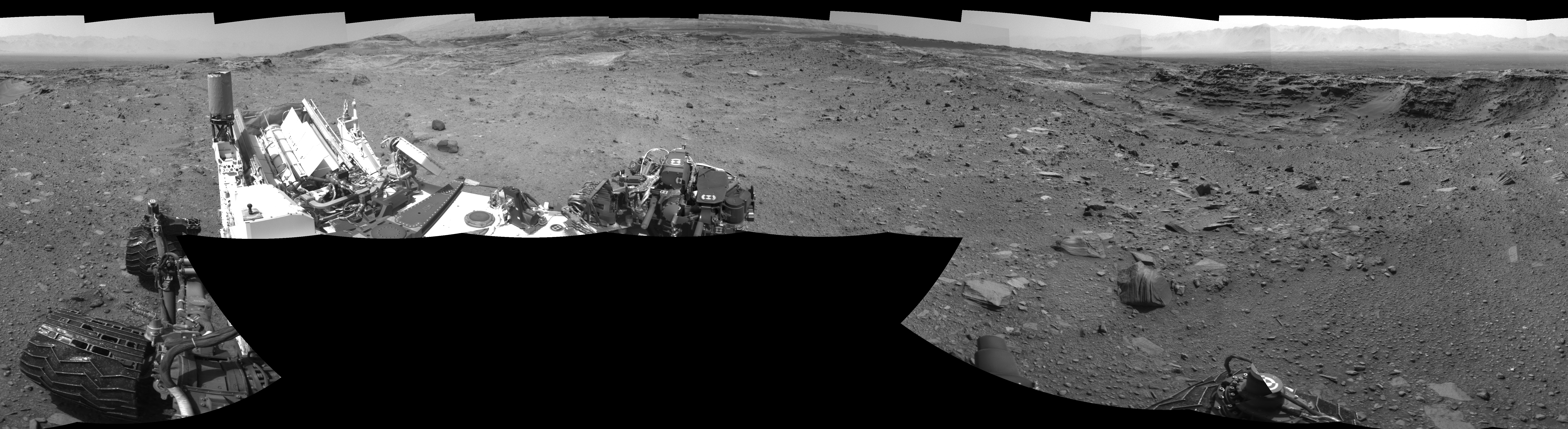 NASA's Mars rover Curiosity took 17 images in Gale Crater using its mast-mounted Left Navigation Camera (Navcam) to create this mosaic. The seam-corrected mosaic provides a 360-degree cylindrical-perspective projection panorama of the Martian surface suitable for stereo viewing, centered at 319 degrees azimuth (measured clockwise from north). This single-eye view must be combined with the partner right image to be viewed in stereo. Curiosity took the images on September 09, 2015, Sol 1099 of the Mars Science Laboratory mission at drive 2626, site number 49. The local mean solar time for the image exposures was 2 PM. Each Navcam image has a 45-degree field of view. CREDIT: NASA/JPL-Caltech