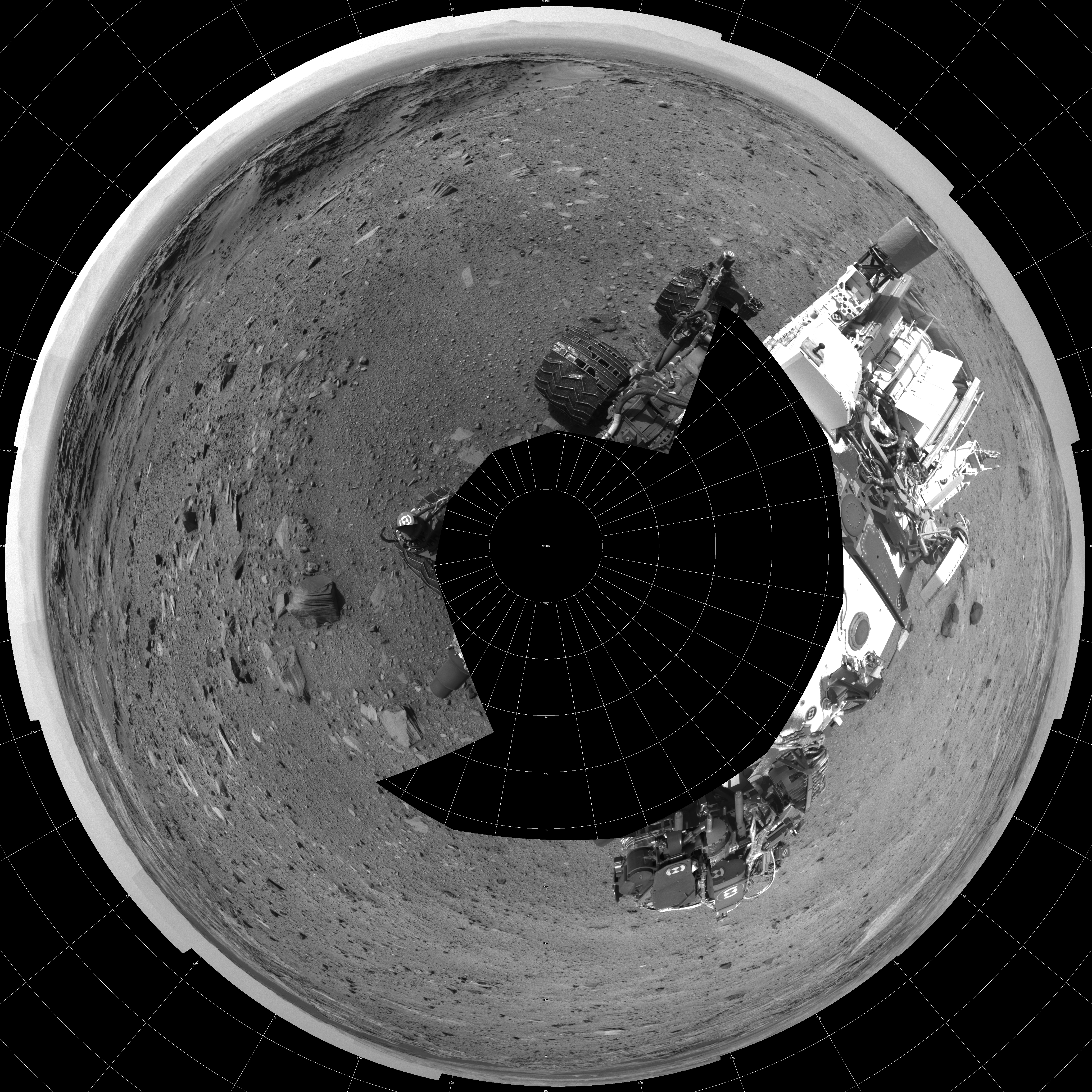 NASA's Mars rover Curiosity took 17 images in Gale Crater using its mast-mounted Left Navigation Camera (Navcam) to create this mosaic. The seam-corrected mosaic provides a polar stereographic projection panorama of the Martian surface with 0 degrees azimuth (measured clockwise from north) at the top of the image. Curiosity took the images on September 09, 2015, Sol 1099 of the Mars Science Laboratory mission at drive 2626, site number 49. The local mean solar time for the image exposures was 2 PM. Each Navcam image has a 45-degree field of view. CREDIT: NASA/JPL-Caltech
