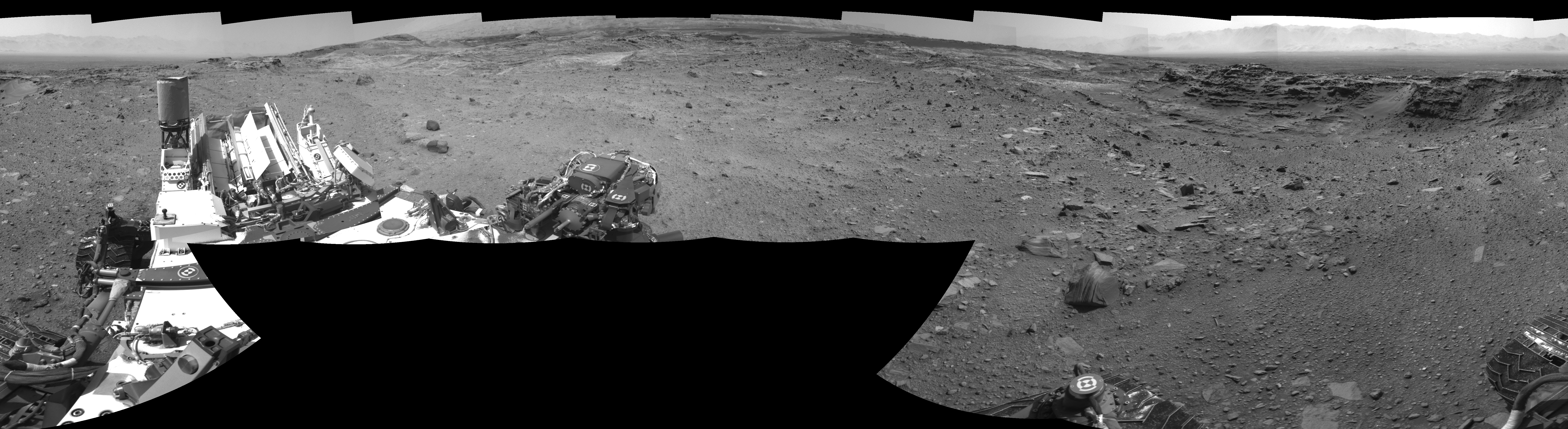 NASA's Mars rover Curiosity took 17 images in Gale Crater using its mast-mounted Right Navigation Camera (Navcam) to create this mosaic. The seam-corrected mosaic provides a 360-degree cylindrical-perspective projection panorama of the Martian surface suitable for stereo viewing, centered at 316 degrees azimuth (measured clockwise from north). This single-eye view must be combined with the partner left image to be viewed in stereo. Curiosity took the images on September 09, 2015, Sol 1099 of the Mars Science Laboratory mission at drive 2626, site number 49. The local mean solar time for the image exposures was 2 PM. Each Navcam image has a 45-degree field of view. CREDIT: NASA/JPL-Caltech