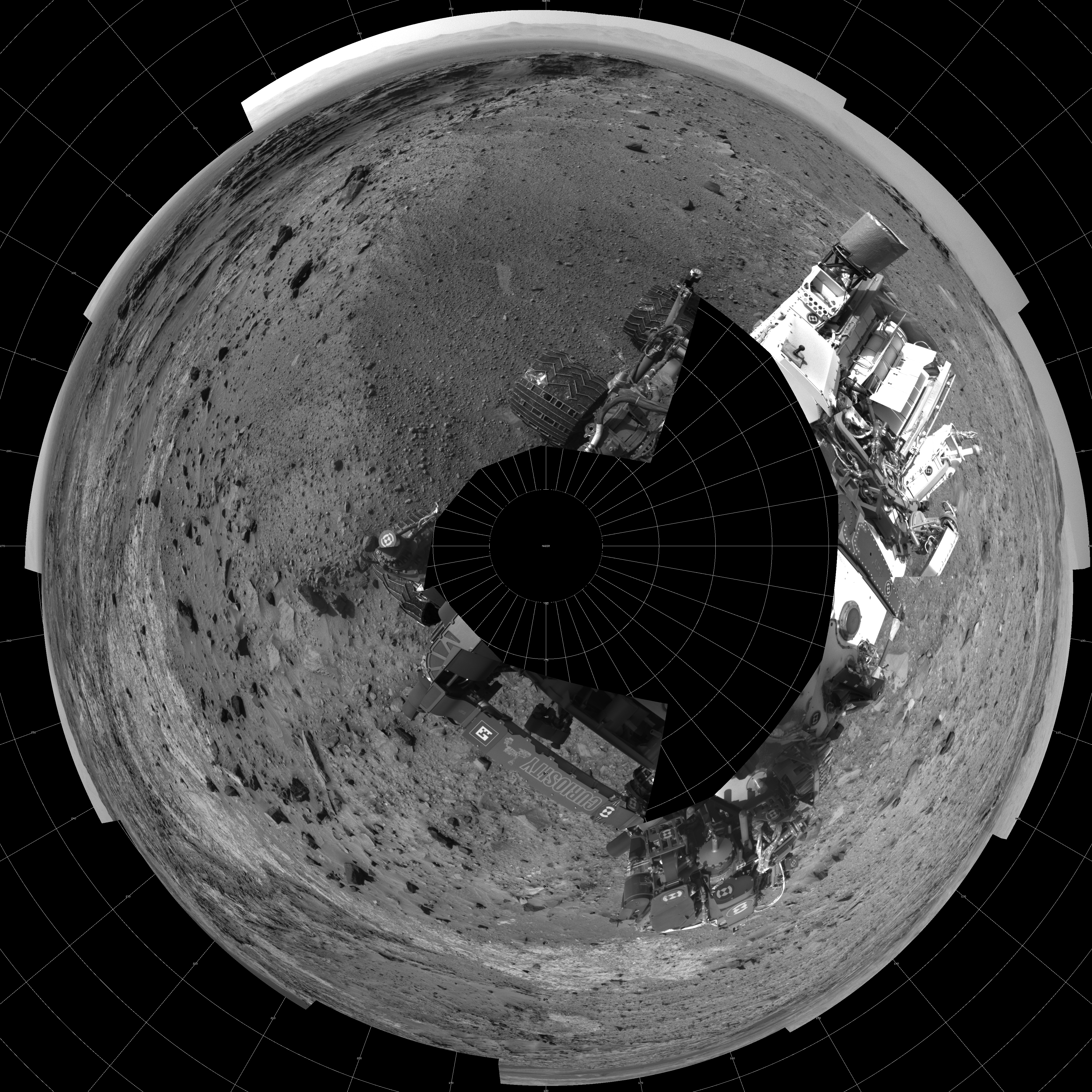 NASA's Mars rover Curiosity took 19 images in Gale Crater using its mast-mounted Left Navigation Camera (Navcam) to create this mosaic. The seam-corrected mosaic provides a polar stereographic projection panorama of the Martian surface with 0 degrees azimuth (measured clockwise from north) at the top of the image. Curiosity took the images on September 10, 2015, Sol 1100 of the Mars Science Laboratory mission at drive 2902, site number 49. The local mean solar time for the image exposures was from 2 PM to 3 PM. Each Navcam image has a 45-degree field of view. CREDIT: NASA/JPL-Caltech