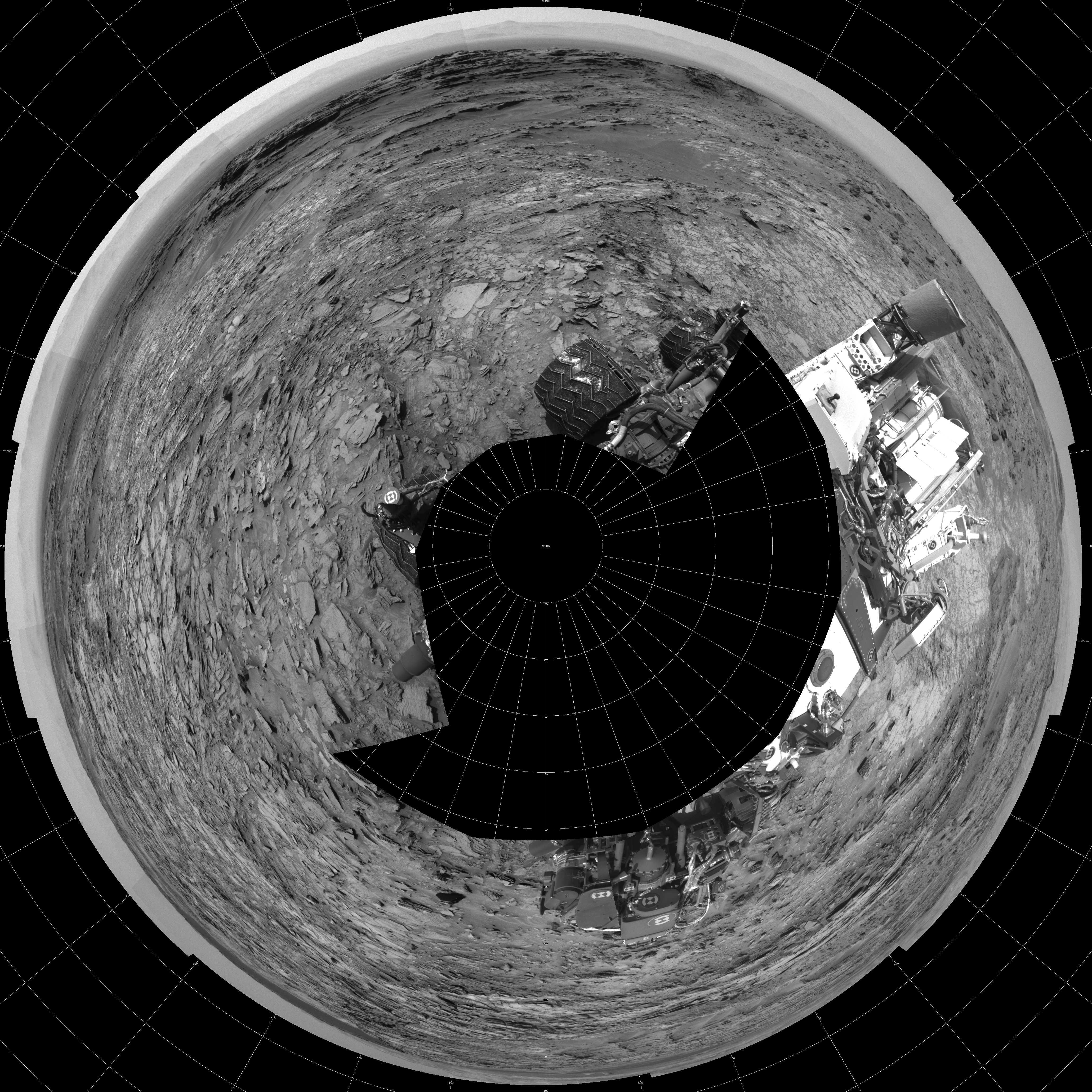 NASA's Mars rover Curiosity took 17 images in Gale Crater using its mast-mounted Left Navigation Camera (Navcam) to create this mosaic. The seam-corrected mosaic provides a polar stereographic projection panorama of the Martian surface with 0 degrees azimuth (measured clockwise from north) at the top of the image. Curiosity took the images on September 17, 2015, Sol 1106 of the Mars Science Laboratory mission at drive 114, site number 50. The local mean solar time for the image exposures was from 1 PM to 2 PM. Each Navcam image has a 45-degree field of view. CREDIT: NASA/JPL-Caltech