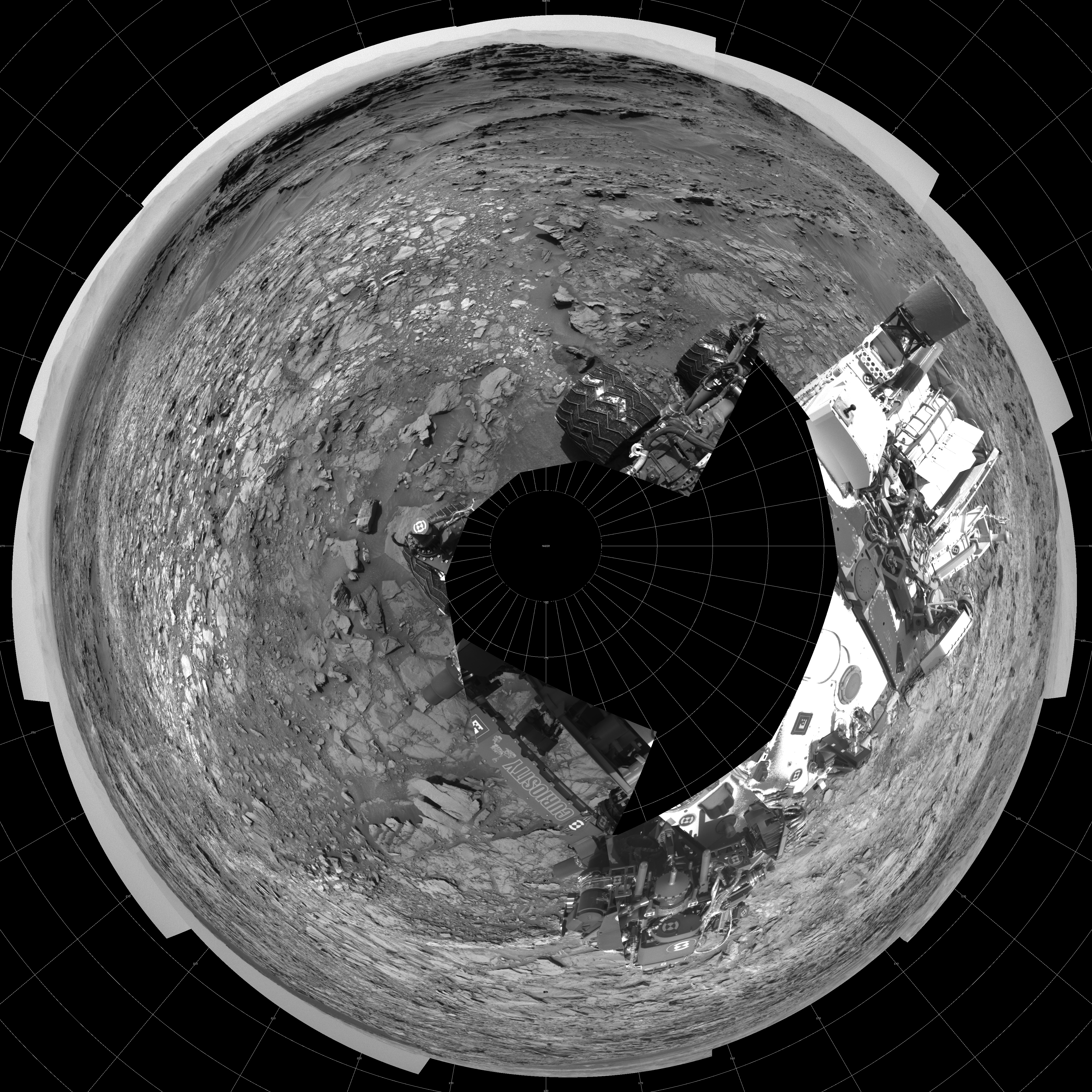 NASA's Mars rover Curiosity took 18 images in Gale Crater using its mast-mounted Left Navigation Camera (Navcam) to create this mosaic. The seam-corrected mosaic provides a polar stereographic projection panorama of the Martian surface with 0 degrees azimuth (measured clockwise from north) at the top of the image. Curiosity took the images on September 18, 2015, Sol 1107 of the Mars Science Laboratory mission at drive 250, site number 50. The local mean solar time for the image exposures was 1 PM. Each Navcam image has a 45-degree field of view. CREDIT: NASA/JPL-Caltech
