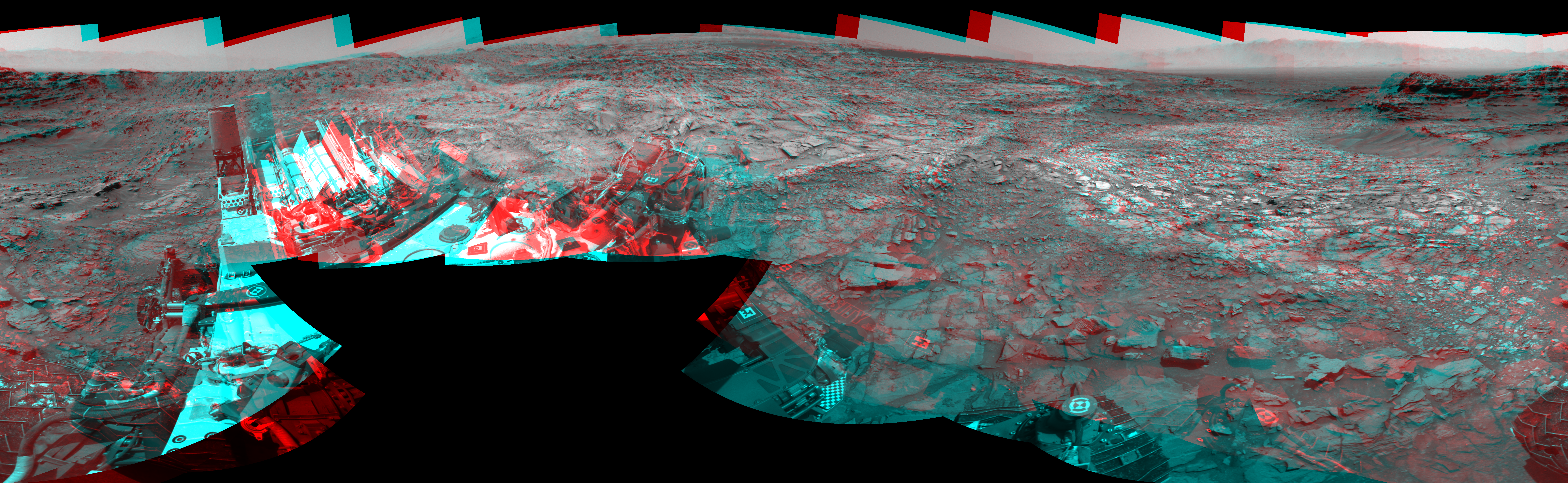 NASA's Mars rover Curiosity took 18 image pairs in Gale Crater using its mast-mounted Navigation Camera (Navcam) to create this mosaic. The seam-corrected mosaic provides a 360-degree cylindrical perspective projection panorama of the Martian surface suitable for stereo viewing, centered at 311 degrees azimuth (measured clockwise from north). This anaglyph must be viewed with red/blue glasses (red over left eye). Curiosity took the images on September 18, 2015, Sol 1107 of the Mars Science Laboratory mission at drive 250, site number 50. The local mean solar time for the image exposures was 1 PM. Each Navcam image has a 45-degree field of view. CREDIT: NASA/JPL-Caltech