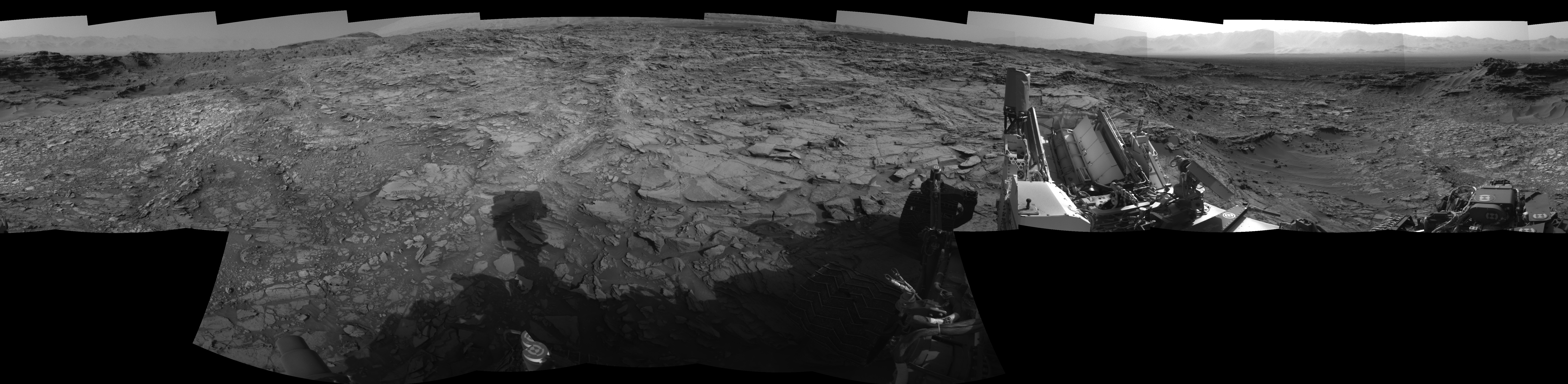 NASA's Mars rover Curiosity took 17 images in Gale Crater using its mast-mounted Left Navigation Camera (Navcam) to create this mosaic. The seam-corrected mosaic provides a 360-degree cylindrical-perspective projection panorama of the Martian surface suitable for stereo viewing, centered at 134 degrees azimuth (measured clockwise from north). This single-eye view must be combined with the partner right image to be viewed in stereo. Curiosity took the images on September 21, 2015, Sol 1110 of the Mars Science Laboratory mission at drive 448, site number 50. The local mean solar time for the image exposures was from 3 PM to 4 PM. Each Navcam image has a 45-degree field of view. CREDIT: NASA/JPL-Caltech