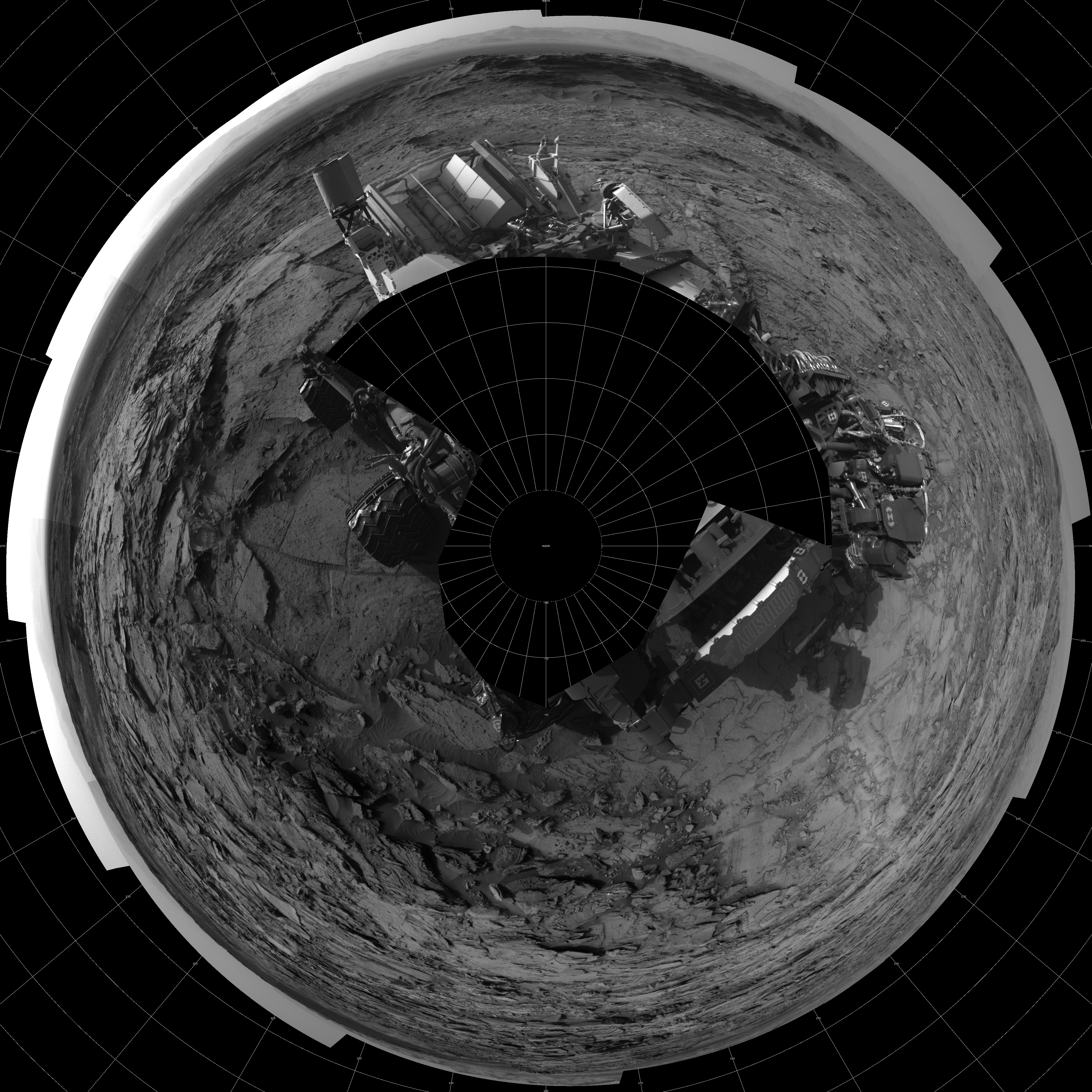 NASA's Mars rover Curiosity took 19 images in Gale Crater using its mast-mounted Left Navigation Camera (Navcam) to create this mosaic. The seam-corrected mosaic provides a polar stereographic projection panorama of the Martian surface with 0 degrees azimuth (measured clockwise from north) at the top of the image. Curiosity took the images on September 23, 2015, Sol 1112 of the Mars Science Laboratory mission at drive 592, site number 50. The local mean solar time for the image exposures was 4 PM. Each Navcam image has a 45-degree field of view. CREDIT: NASA/JPL-Caltech