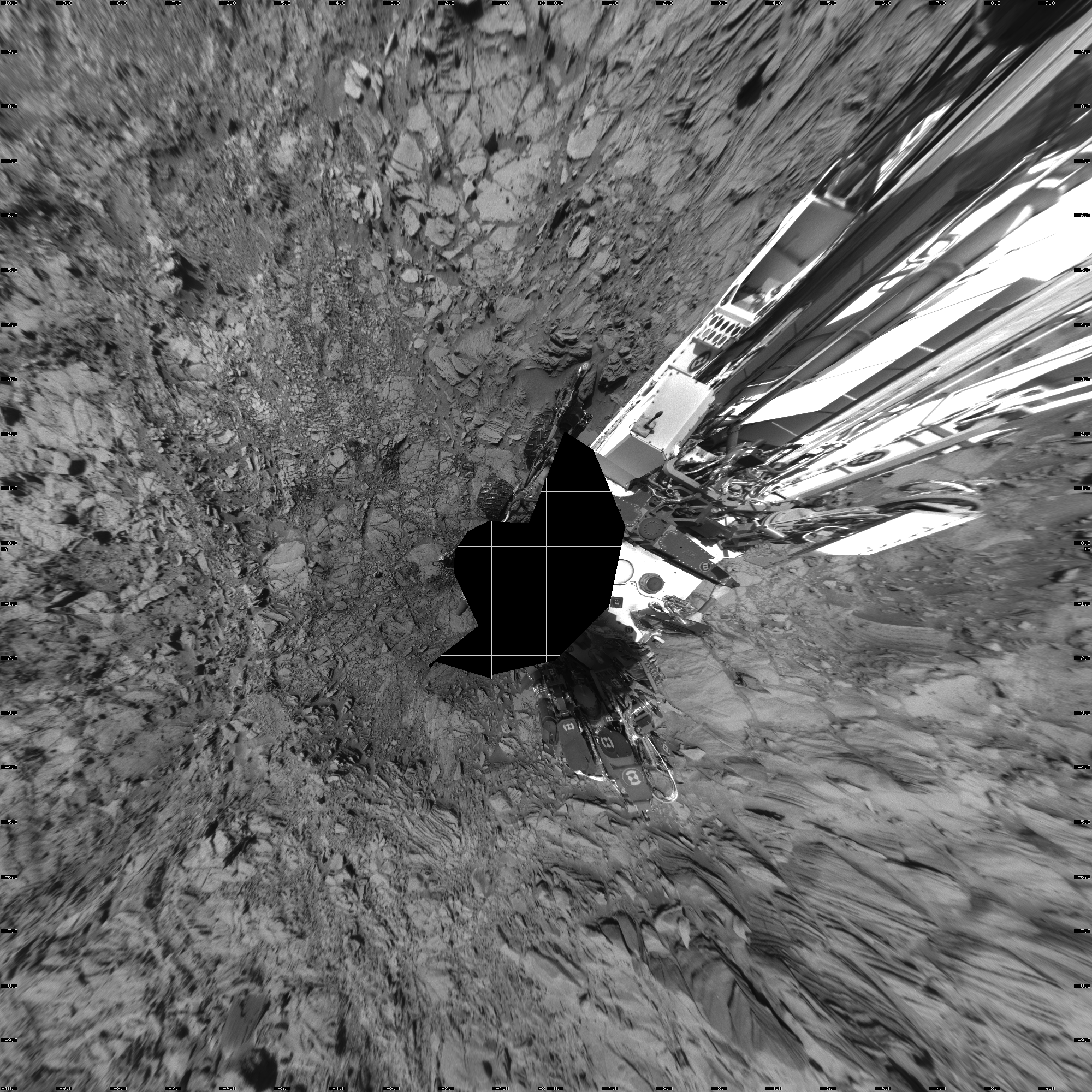 NASA's Mars rover Curiosity took 17 images in Gale Crater using its mast-mounted Left Navigation Camera (Navcam) to create this mosaic. The seam-corrected mosaic provides a vertical projection of the Martian surface near the rover, covering an area of 20 meters (north/south) by 20 meters (east/west). North is up in the image. This projection provides an overhead view, but introduces distortion for items not on the surface, such as large rocks and the rover itself. Curiosity took the images on October 26, 2015, Sol 1144 of the Mars Science Laboratory mission at drive 848, site number 50. The local mean solar time for the image exposures was 3 PM. Each Navcam image has a 45-degree field of view. CREDIT: NASA/JPL-Caltech