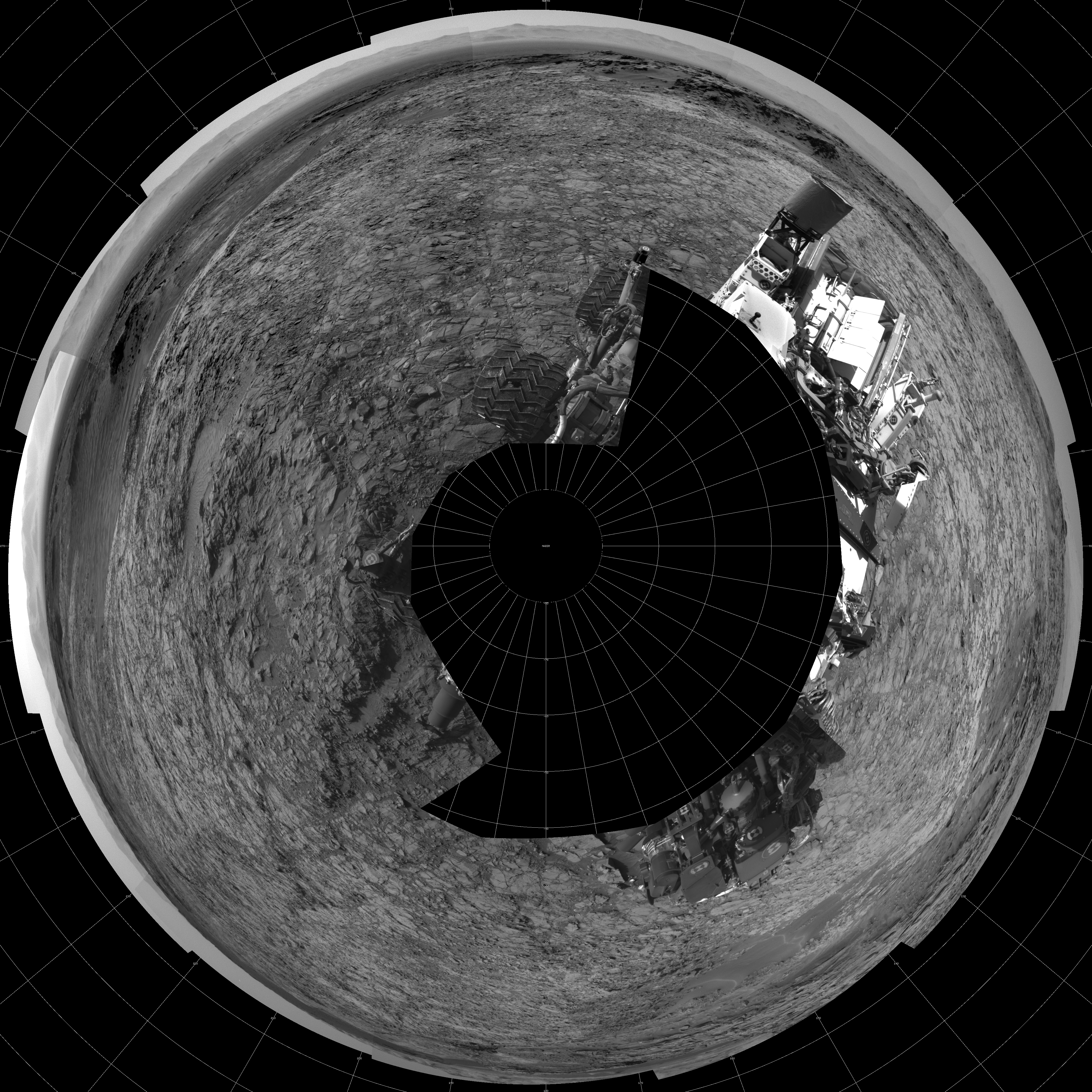 NASA's Mars rover Curiosity took 17 images in Gale Crater using its mast-mounted Left Navigation Camera (Navcam) to create this mosaic. The seam-corrected mosaic provides a polar stereographic projection panorama of the Martian surface with 0 degrees azimuth (measured clockwise from north) at the top of the image. Curiosity took the images on November 04, 2015, Sol 1153 of the Mars Science Laboratory mission at drive 1624, site number 50. The local mean solar time for the image exposures was 4 PM. Each Navcam image has a 45-degree field of view. CREDIT: NASA/JPL-Caltech