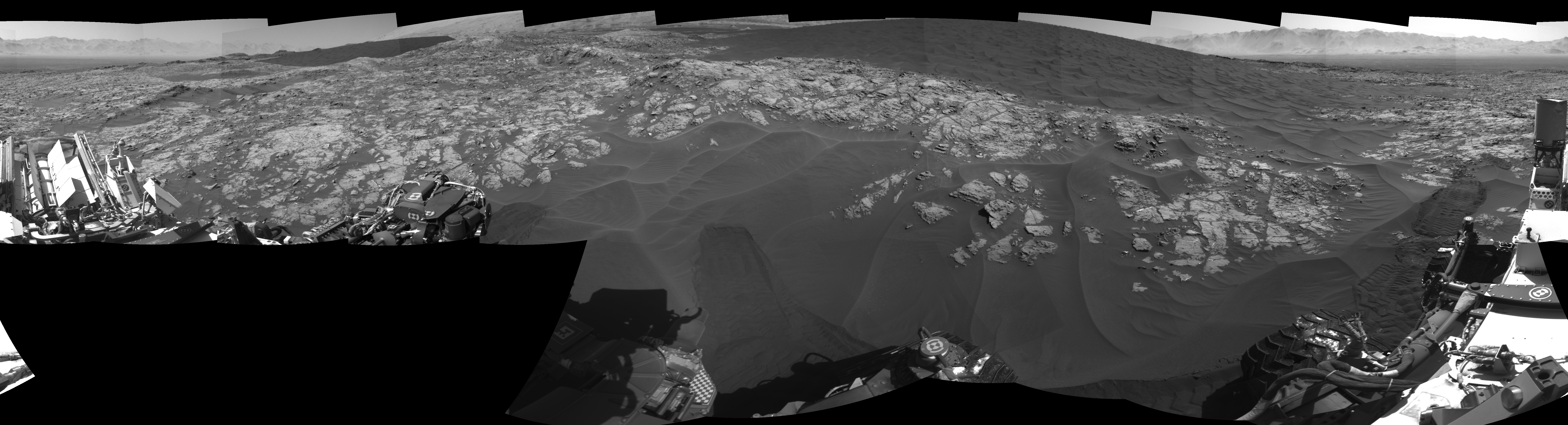 NASA's Mars rover Curiosity took 19 images in Gale Crater using its mast-mounted Right Navigation Camera (Navcam) to create this mosaic. The seam-corrected mosaic provides a 0-degree cylindrical-perspective projection panorama of the Martian surface suitable for stereo viewing, centered at 179 degrees azimuth (measured clockwise from north). This single-eye view must be combined with the partner left image to be viewed in stereo. Curiosity took the images on December 03, 2015, Sol 1181 of the Mars Science Laboratory mission at drive 1298, site number 51. The local mean solar time for the image exposures was 1 PM. Each Navcam image has a 45-degree field of view. CREDIT: NASA/JPL-Caltech
