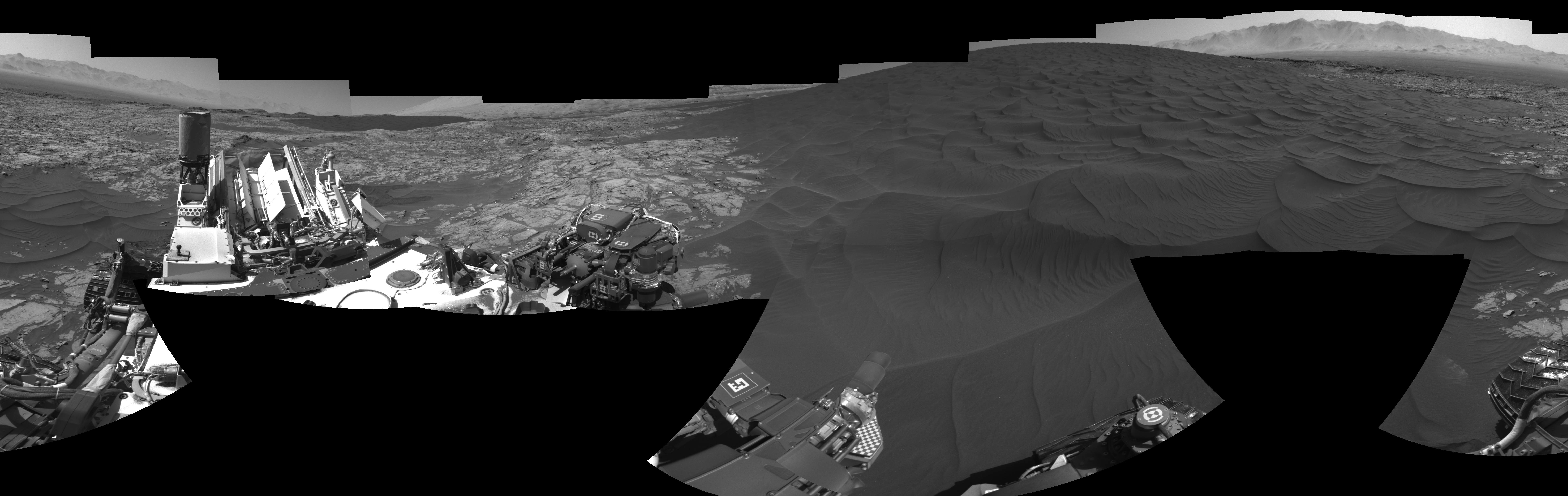 NASA's Mars rover Curiosity took 15 images in Gale Crater using its mast-mounted Right Navigation Camera (Navcam) to create this mosaic. The seam-corrected mosaic provides a 0-degree cylindrical-perspective projection panorama of the Martian surface suitable for stereo viewing, centered at 131 degrees azimuth (measured clockwise from north). This single-eye view must be combined with the partner left image to be viewed in stereo. Curiosity took the images on December 05, 2015, Sol 1183 of the Mars Science Laboratory mission at drive 1430, site number 51. The local mean solar time for the image exposures was 2 PM. Each Navcam image has a 45-degree field of view. CREDIT: NASA/JPL-Caltech