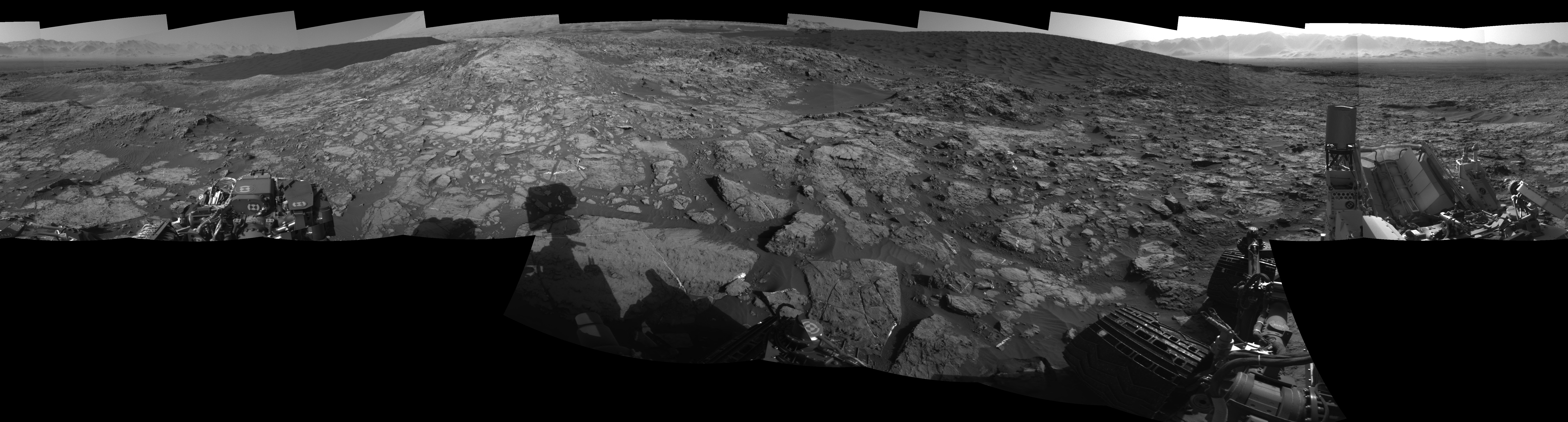 NASA's Mars rover Curiosity took 17 images in Gale Crater using its mast-mounted Left Navigation Camera (Navcam) to create this mosaic. The seam-corrected mosaic provides a 360-degree cylindrical-perspective projection panorama of the Martian surface suitable for stereo viewing, centered at 61 degrees azimuth (measured clockwise from north). This single-eye view must be combined with the partner right image to be viewed in stereo. Curiosity took the images on December 07, 2015, Sol 1185 of the Mars Science Laboratory mission at drive 1800, site number 51. The local mean solar time for the image exposures was 3 PM. Each Navcam image has a 45-degree field of view. CREDIT: NASA/JPL-Caltech