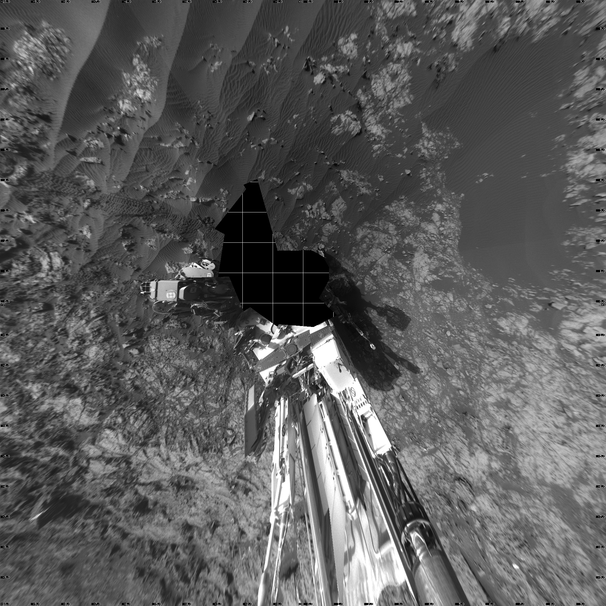 NASA's Mars rover Curiosity took 17 images in Gale Crater using its mast-mounted Left Navigation Camera (Navcam) to create this mosaic. The seam-corrected mosaic provides a vertical projection of the Martian surface near the rover, covering an area of 20 meters (north/south) by 20 meters (east/west). North is up in the image. This projection provides an overhead view, but introduces distortion for items not on the surface, such as large rocks and the rover itself. Curiosity took the images on December 16, 2015, Sol 1194 of the Mars Science Laboratory mission at drive 2704, site number 51. The local mean solar time for the image exposures was 4 PM. Each Navcam image has a 45-degree field of view. CREDIT: NASA/JPL-Caltech
