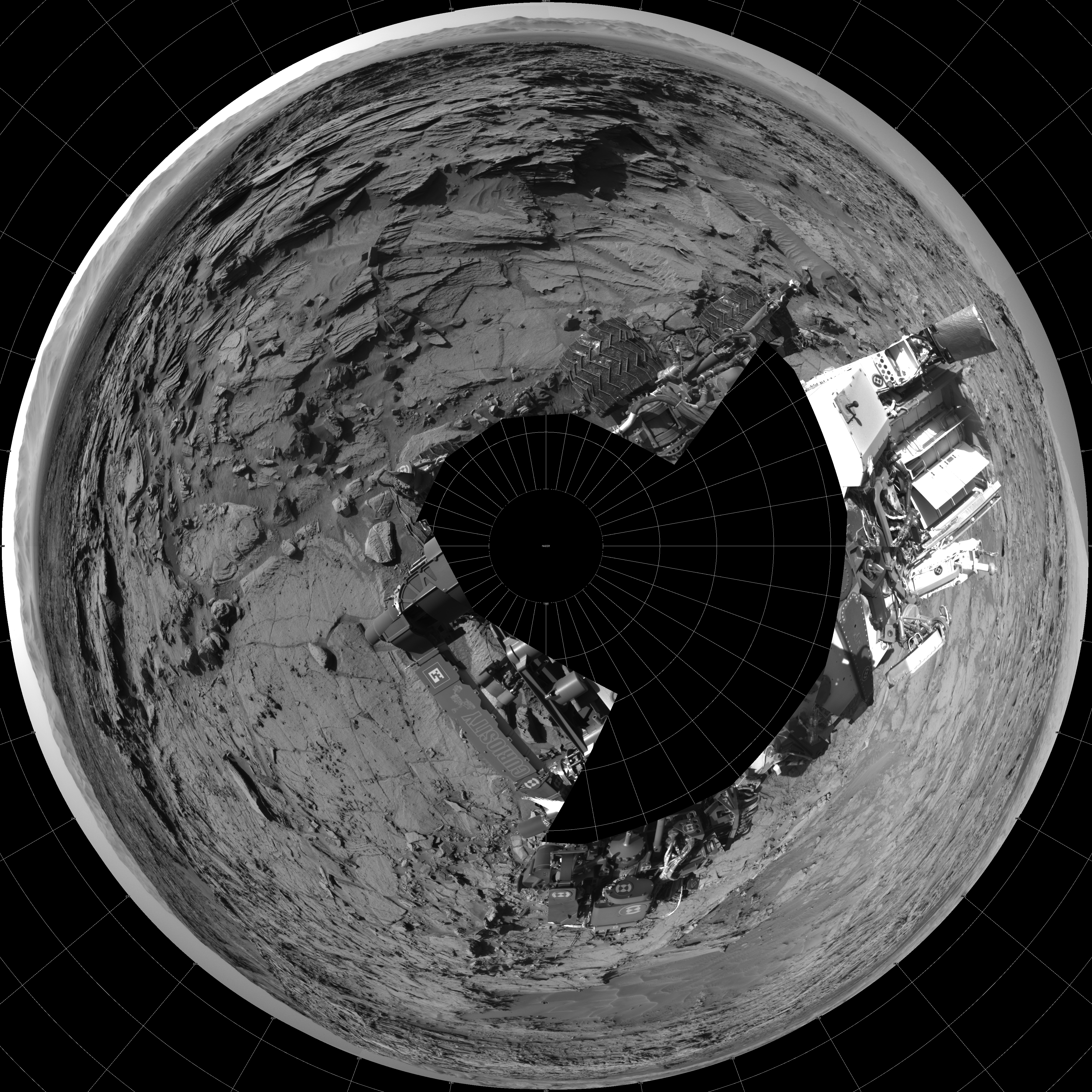NASA's Mars rover Curiosity took 19 images in Gale Crater using its mast-mounted Left Navigation Camera (Navcam) to create this mosaic. The seam-corrected mosaic provides a polar stereographic projection panorama of the Martian surface with 0 degrees azimuth (measured clockwise from north) at the top of the image. Curiosity took the images on April 01, 2016, Sol 1298 of the Mars Science Laboratory mission at drive 2980, site number 53. The local mean solar time for the image exposures was 3 PM. Each Navcam image has a 45-degree field of view. CREDIT: NASA/JPL-Caltech