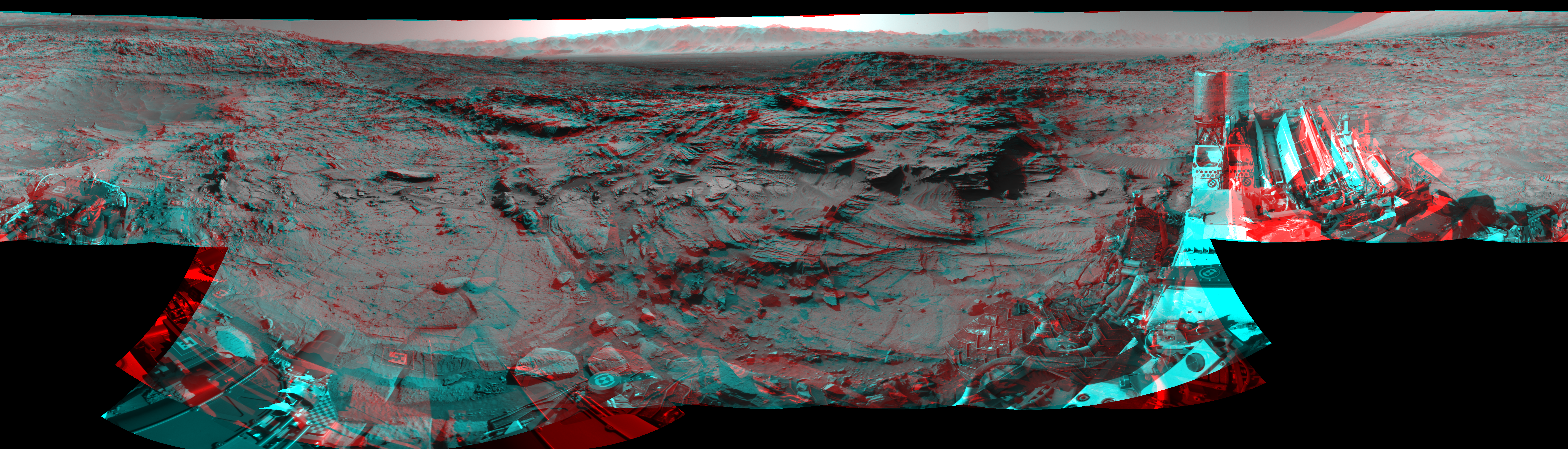 NASA's Mars rover Curiosity took 19 image pairs in Gale Crater using its mast-mounted Navigation Camera (Navcam) to create this mosaic. The seam-corrected mosaic provides a 360-degree cylindrical perspective projection panorama of the Martian surface suitable for stereo viewing, centered at 85 degrees azimuth (measured clockwise from north). This anaglyph must be viewed with red/blue glasses (red over left eye). Curiosity took the images on April 01, 2016, Sol 1298 of the Mars Science Laboratory mission at drive 2980, site number 53. The local mean solar time for the image exposures was 3 PM. Each Navcam image has a 45-degree field of view. CREDIT: NASA/JPL-Caltech