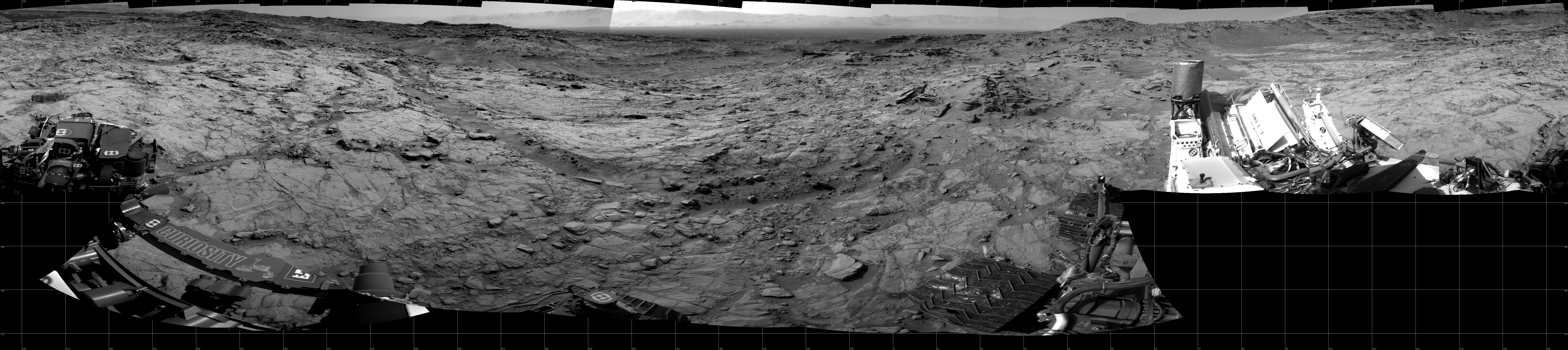 NASA's Mars rover Curiosity took 18 images in Gale Crater using its mast-mounted Left Navigation Camera (Navcam) to create this mosaic. The seam-corrected mosaic provides a 360-degree cylindrical projection panorama of the Martian surface centered at 335 degrees azimuth (measured clockwise from north). Curiosity took the images on May 27, 2016, Sol 1353 of the Mars Science Laboratory mission at drive 2202, site number 54. The local mean solar time for the image exposures was from 1 PM to 2 PM. Each Navcam image has a 45 degree field of view. CREDIT: NASA/JPL-Caltech