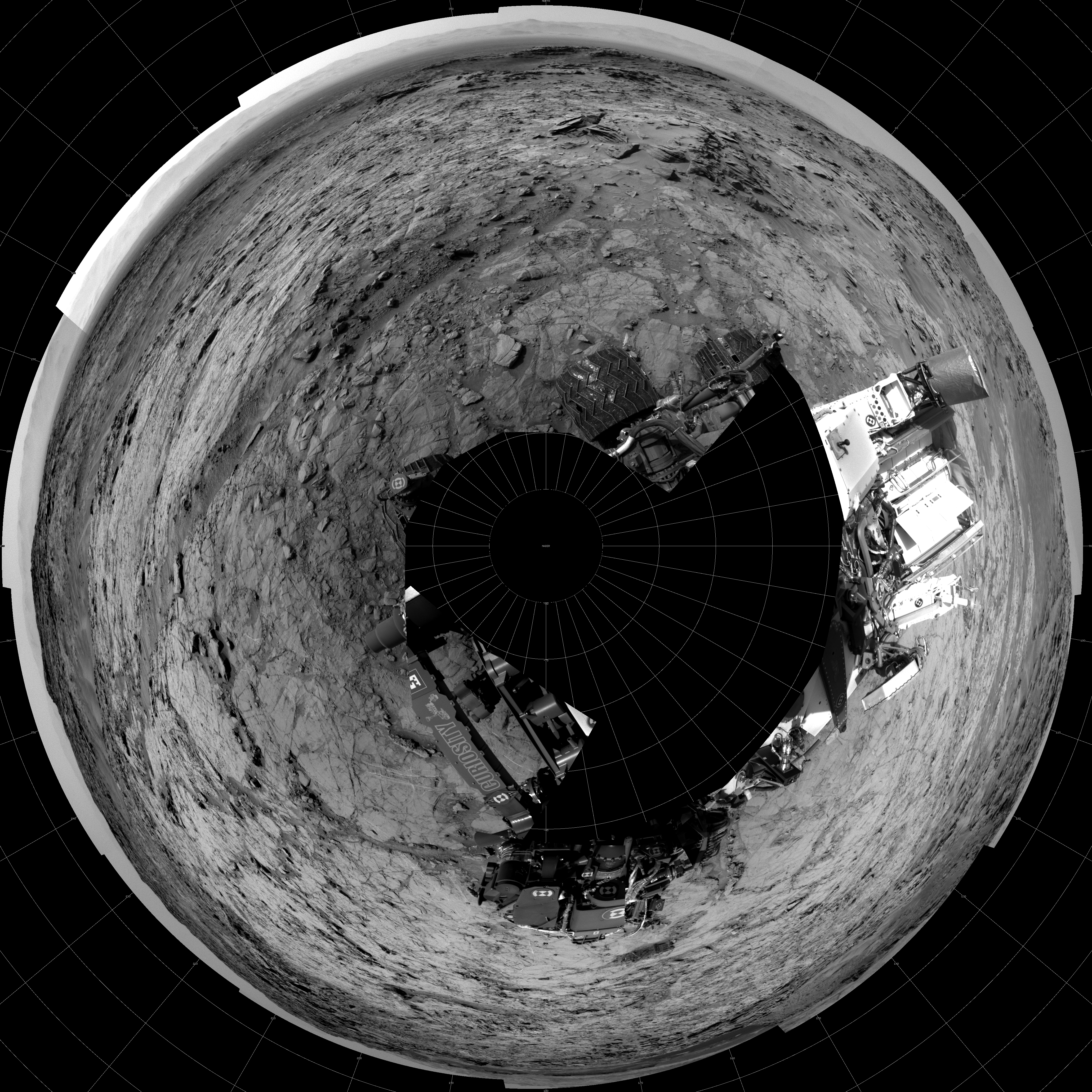NASA's Mars rover Curiosity took 18 images in Gale Crater using its mast-mounted Left Navigation Camera (Navcam) to create this mosaic. The seam-corrected mosaic provides a polar stereographic projection panorama of the Martian surface with 0 degrees azimuth (measured clockwise from north) at the top of the image. Curiosity took the images on May 27, 2016, Sol 1353 of the Mars Science Laboratory mission at drive 2202, site number 54. The local mean solar time for the image exposures was from 1 PM to 2 PM. Each Navcam image has a 45-degree field of view. CREDIT: NASA/JPL-Caltech