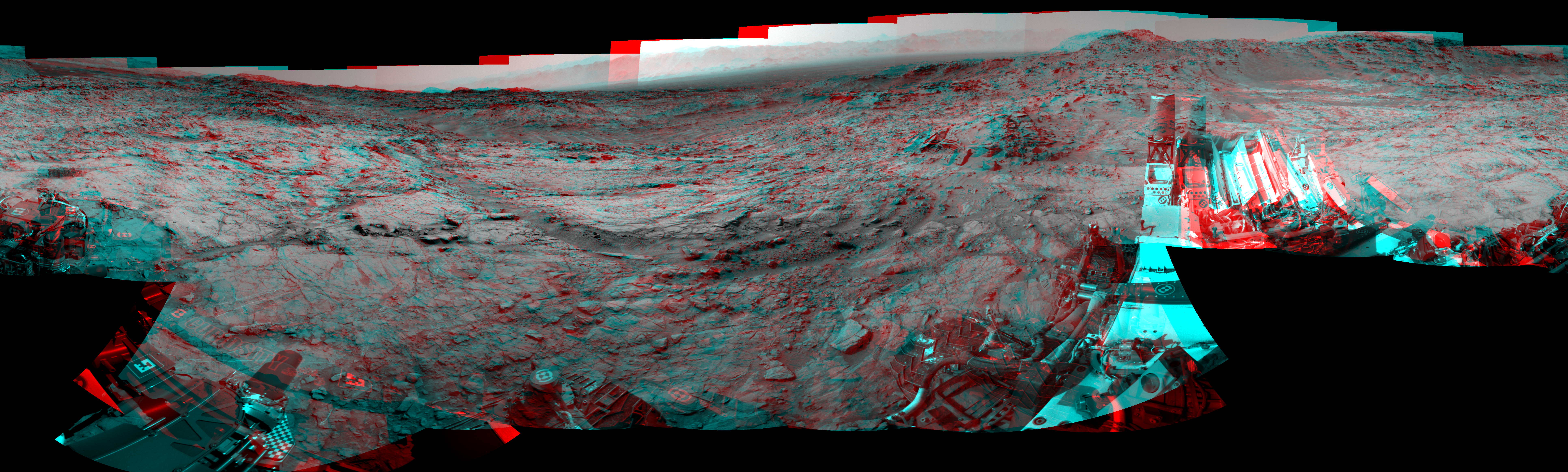NASA's Mars rover Curiosity took 18 image pairs in Gale Crater using its mast-mounted Navigation Camera (Navcam) to create this mosaic. The seam-corrected mosaic provides a 360-degree cylindrical perspective projection panorama of the Martian surface suitable for stereo viewing, centered at 95 degrees azimuth (measured clockwise from north). This anaglyph must be viewed with red/blue glasses (red over left eye). Curiosity took the images on May 27, 2016, Sol 1353 of the Mars Science Laboratory mission at drive 2202, site number 54. The local mean solar time for the image exposures was from 1 PM to 2 PM. Each Navcam image has a 45-degree field of view. CREDIT: NASA/JPL-Caltech