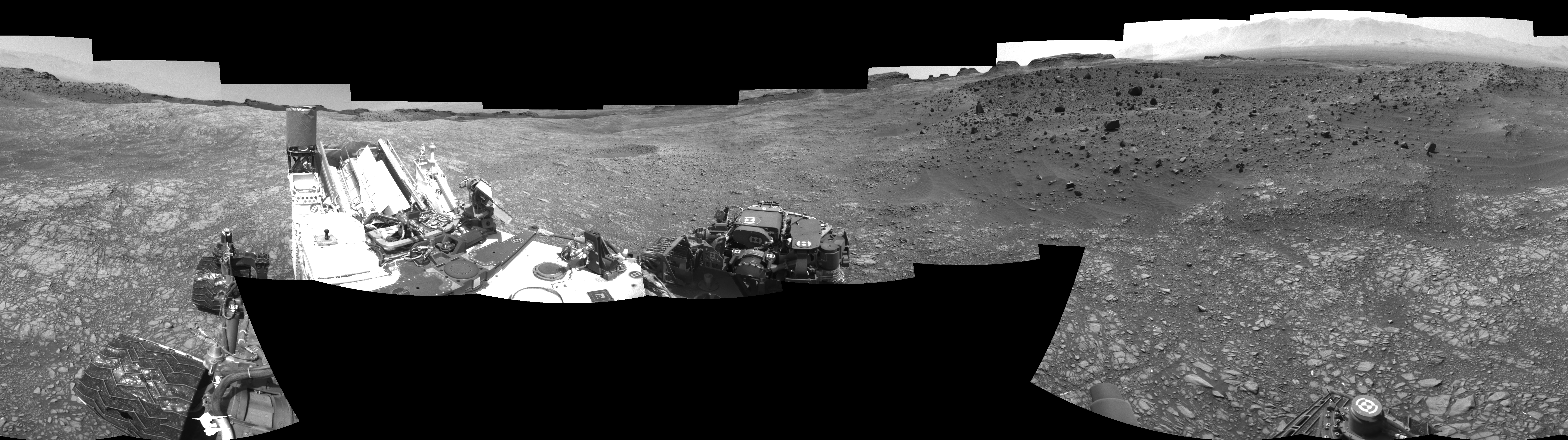 NASA's Mars rover Curiosity took 17 images in Gale Crater using its mast-mounted Left Navigation Camera (Navcam) to create this mosaic. The seam-corrected mosaic provides a 360-degree cylindrical-perspective projection panorama of the Martian surface suitable for stereo viewing, centered at 300 degrees azimuth (measured clockwise from north). This single-eye view must be combined with the partner right image to be viewed in stereo. Curiosity took the images on July 14, 2016, Sol 1399 of the Mars Science Laboratory mission at drive 2098, site number 55. The local mean solar time for the image exposures was 2 PM. Each Navcam image has a 45-degree field of view. CREDIT: NASA/JPL-Caltech