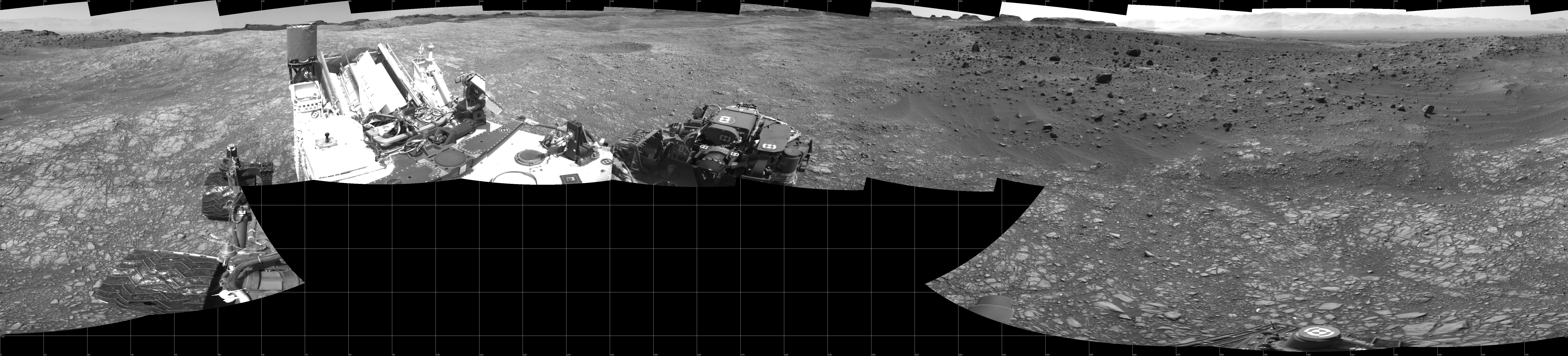 NASA's Mars rover Curiosity took 17 images in Gale Crater using its mast-mounted Left Navigation Camera (Navcam) to create this mosaic. The seam-corrected mosaic provides a 360-degree cylindrical projection panorama of the Martian surface centered at 180 degrees azimuth (measured clockwise from north). Curiosity took the images on July 14, 2016, Sol 1399 of the Mars Science Laboratory mission at drive 2098, site number 55. The local mean solar time for the image exposures was 2 PM. Each Navcam image has a 45 degree field of view. CREDIT: NASA/JPL-Caltech