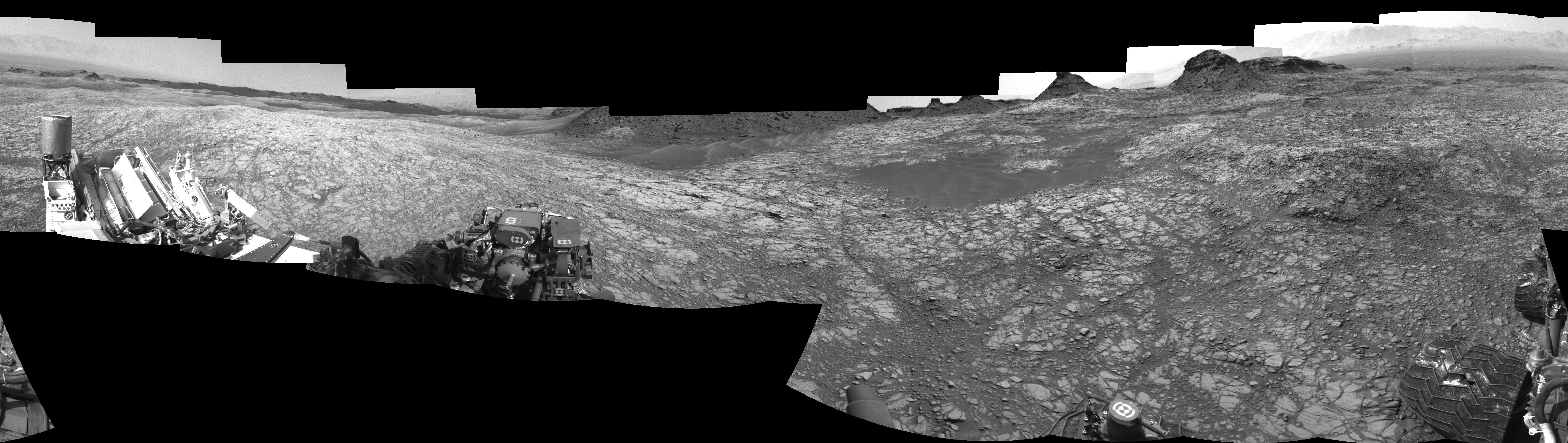 NASA's Mars rover Curiosity took 17 images in Gale Crater using its mast-mounted Left Navigation Camera (Navcam) to create this mosaic. The seam-corrected mosaic provides a 360-degree cylindrical-perspective projection panorama of the Martian surface suitable for stereo viewing, centered at 356 degrees azimuth (measured clockwise from north). This single-eye view must be combined with the partner right image to be viewed in stereo. Curiosity took the images on August 11, 2016, Sol 1427 of the Mars Science Laboratory mission at drive 1326, site number 56. The local mean solar time for the image exposures was 1 PM. Each Navcam image has a 45-degree field of view. CREDIT: NASA/JPL-Caltech
