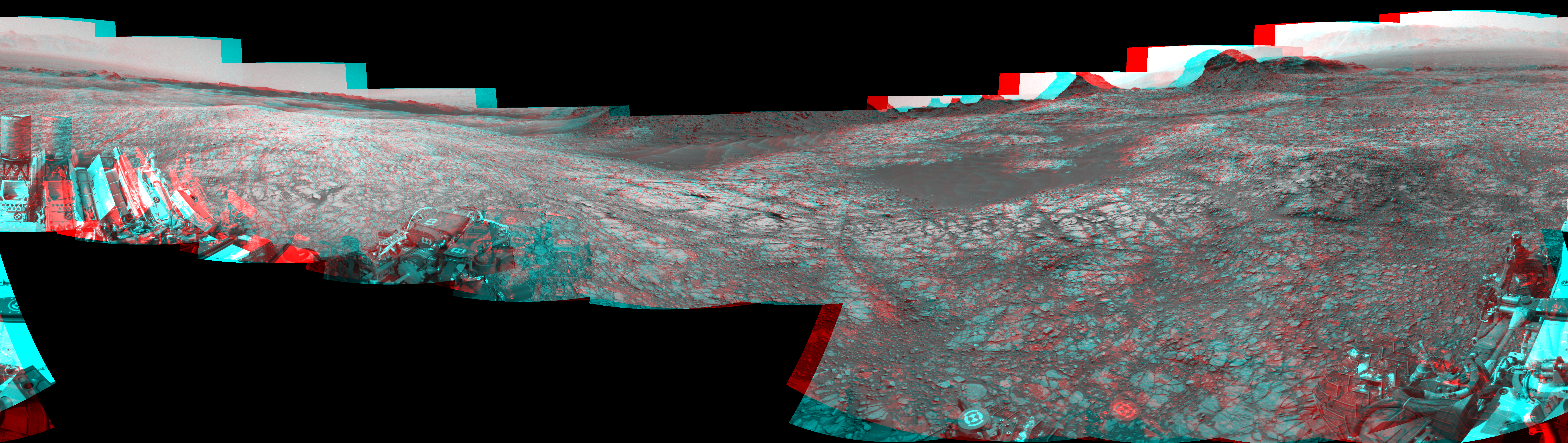 NASA's Mars rover Curiosity took 17 image pairs in Gale Crater using its mast-mounted Navigation Camera (Navcam) to create this mosaic. The seam-corrected mosaic provides a 360-degree cylindrical perspective projection panorama of the Martian surface suitable for stereo viewing, centered at 356 degrees azimuth (measured clockwise from north). This anaglyph must be viewed with red/blue glasses (red over left eye). Curiosity took the images on August 11, 2016, Sol 1427 of the Mars Science Laboratory mission at drive 1326, site number 56. The local mean solar time for the image exposures was 1 PM. Each Navcam image has a 45-degree field of view. CREDIT: NASA/JPL-Caltech