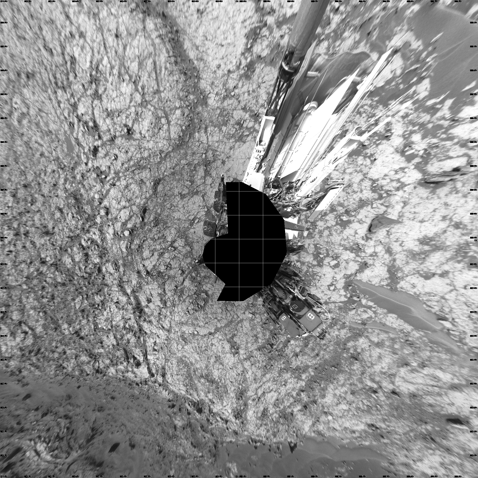 NASA's Mars rover Curiosity took 22 images in Gale Crater using its mast-mounted Left Navigation Camera (Navcam) to create this mosaic. The seam-corrected mosaic provides a vertical projection of the Martian surface near the rover, covering an area of 20 meters (north/south) by 20 meters (east/west). North is up in the image. This projection provides an overhead view, but introduces distortion for items not on the surface, such as large rocks and the rover itself. Curiosity took the images on August 16, 2016, Sol 1431 of the Mars Science Laboratory mission at drive 2034, site number 56. The local mean solar time for the image exposures was 2 PM. Each Navcam image has a 45-degree field of view. CREDIT: NASA/JPL-Caltech