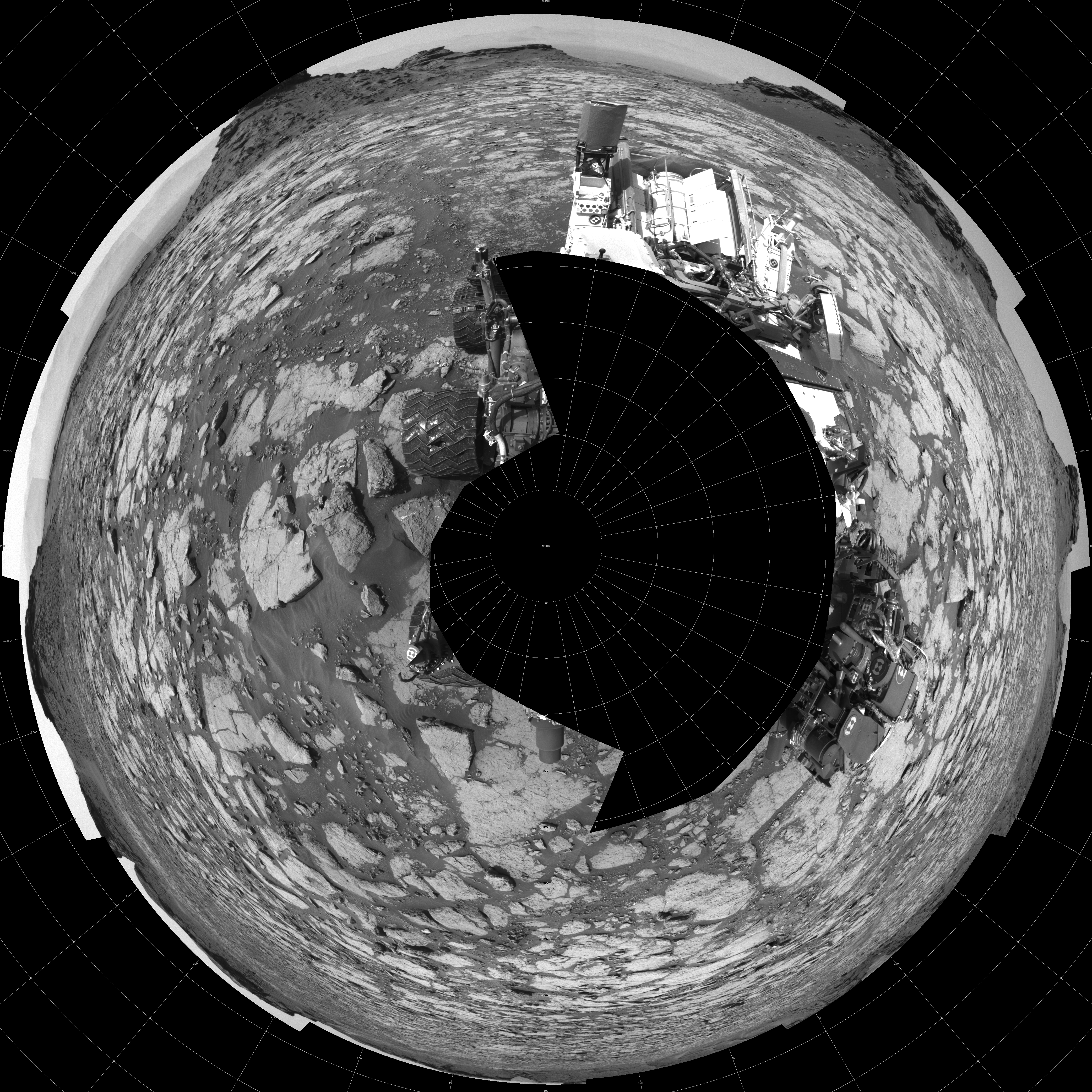 NASA's Mars rover Curiosity took 17 images in Gale Crater using its mast-mounted Left Navigation Camera (Navcam) to create this mosaic. The seam-corrected mosaic provides a polar stereographic projection panorama of the Martian surface with 0 degrees azimuth (measured clockwise from north) at the top of the image. Curiosity took the images on August 18, 2016, Sol 1433 of the Mars Science Laboratory mission at drive 0, site number 57. The local mean solar time for the image exposures was 1 PM. Each Navcam image has a 45-degree field of view. CREDIT: NASA/JPL-Caltech