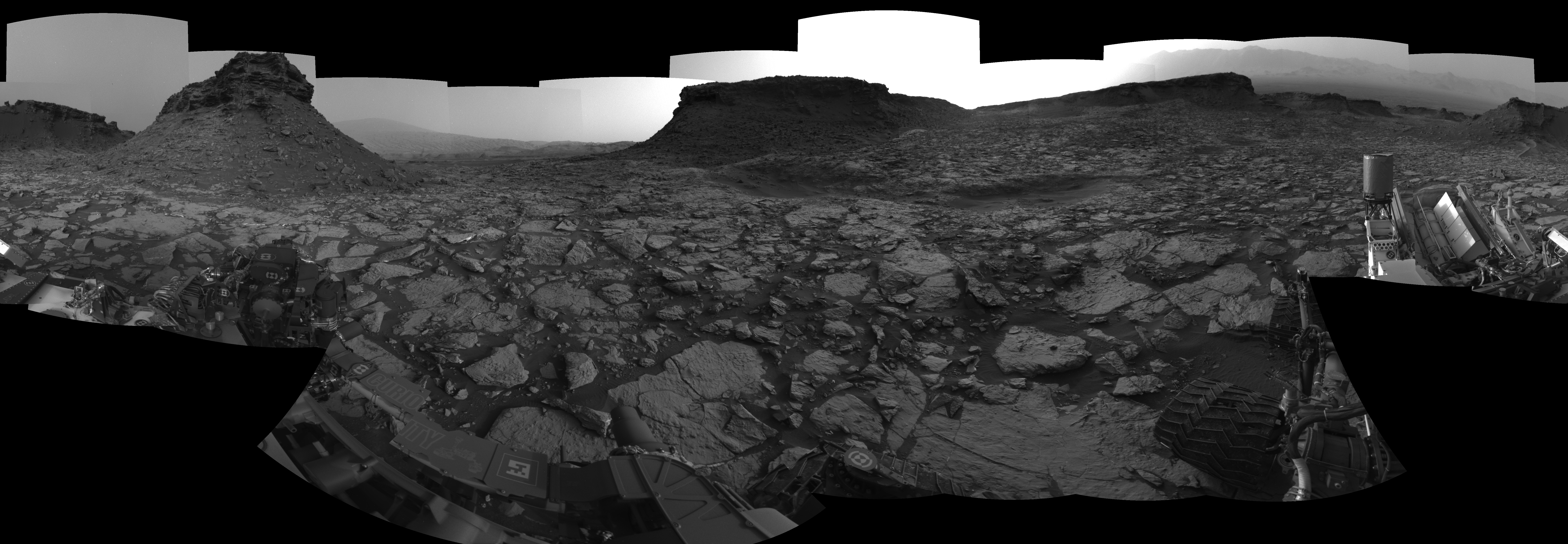 NASA's Mars rover Curiosity took 26 images in Gale Crater using its mast-mounted Left Navigation Camera (Navcam) to create this mosaic. The seam-corrected mosaic provides a 360-degree cylindrical-perspective projection panorama of the Martian surface suitable for stereo viewing, centered at 53 degrees azimuth (measured clockwise from north). This single-eye view must be combined with the partner right image to be viewed in stereo. Curiosity took the images on September 02, 2016, Sol 1448 of the Mars Science Laboratory mission at drive 1942, site number 57. The local mean solar time for the image exposures was from 4 PM to 5 PM. Each Navcam image has a 45-degree field of view. CREDIT: NASA/JPL-Caltech