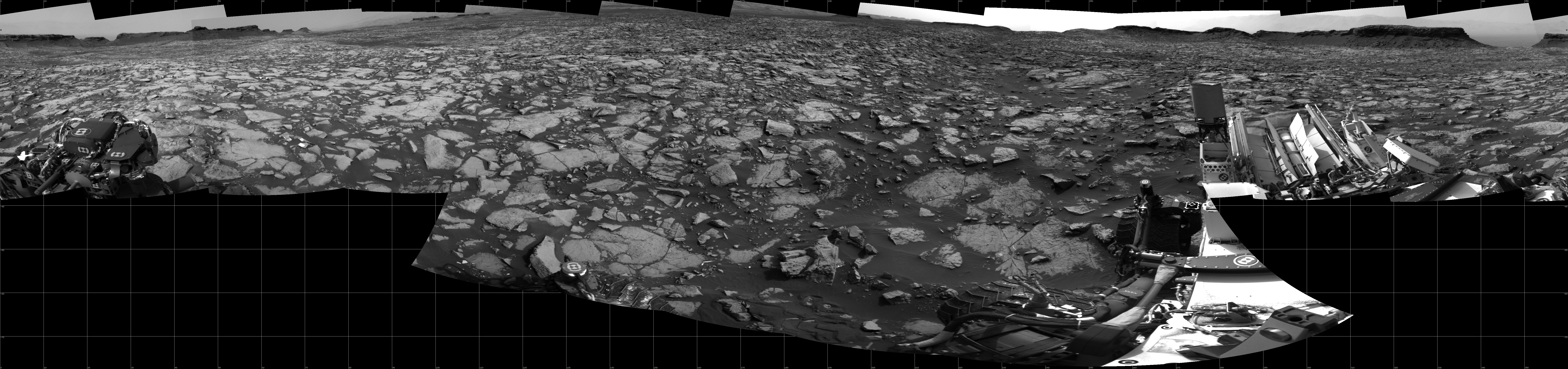 NASA's Mars rover Curiosity took 17 images in Gale Crater using its mast-mounted Right Navigation Camera (Navcam) to create this mosaic. The seam-corrected mosaic provides a 360-degree cylindrical projection panorama of the Martian surface centered at 180 degrees azimuth (measured clockwise from north). Curiosity took the images on September 23, 2016, Sol 1468 of the Mars Science Laboratory mission at drive 0, site number 58. The local mean solar time for the image exposures was from 2 PM to 3 PM. Each Navcam image has a 45 degree field of view. CREDIT: NASA/JPL-Caltech