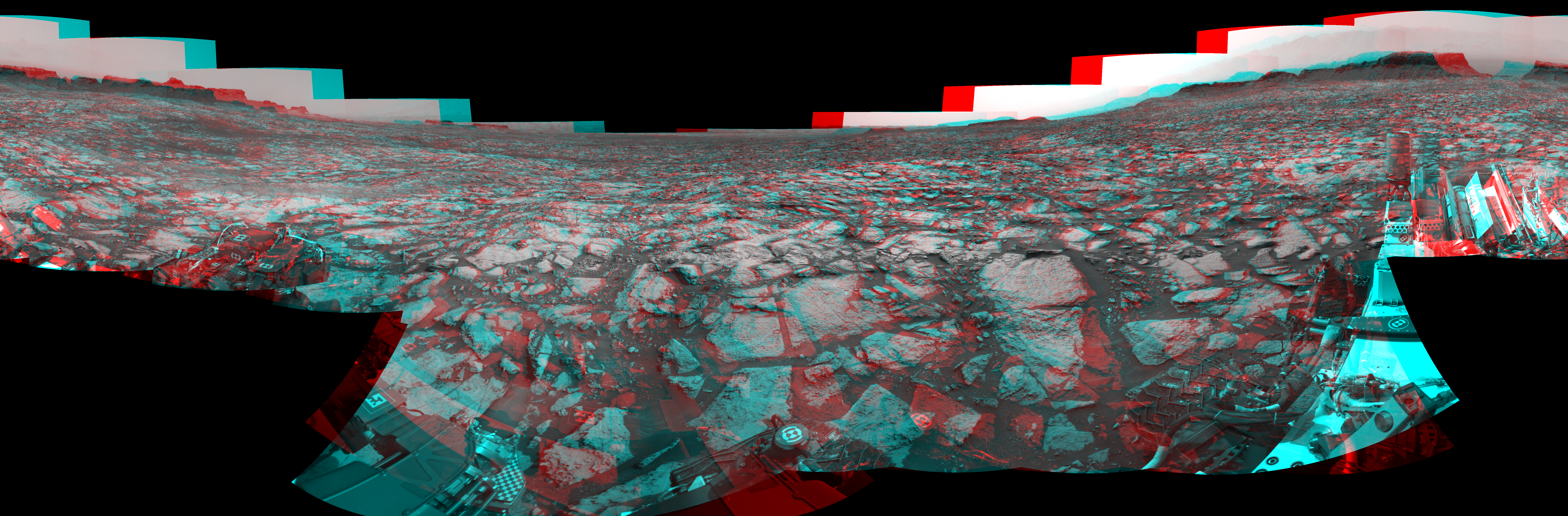NASA's Mars rover Curiosity took 19 image pairs in Gale Crater using its mast-mounted Navigation Camera (Navcam) to create this mosaic. The seam-corrected mosaic provides a 360-degree cylindrical perspective projection panorama of the Martian surface suitable for stereo viewing, centered at 42 degrees azimuth (measured clockwise from north). This anaglyph must be viewed with red/blue glasses (red over left eye). Curiosity took the images on September 24, 2016, Sol 1469 of the Mars Science Laboratory mission at drive 264, site number 58. The local mean solar time for the image exposures was 2 PM. Each Navcam image has a 45-degree field of view. CREDIT: NASA/JPL-Caltech