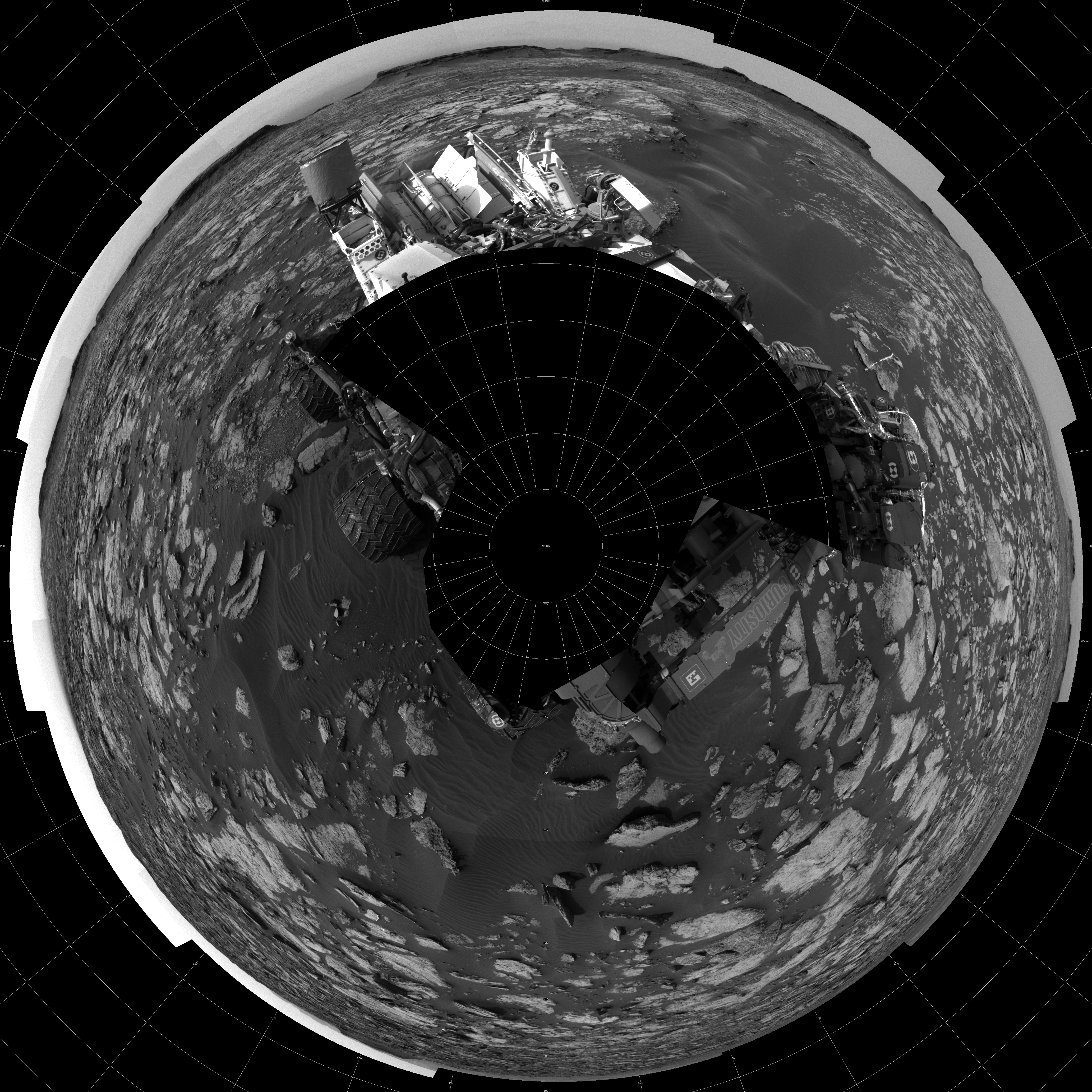 NASA's Mars rover Curiosity took 19 images in Gale Crater using its mast-mounted Left Navigation Camera (Navcam) to create this mosaic. The seam-corrected mosaic provides a polar stereographic projection panorama of the Martian surface with 0 degrees azimuth (measured clockwise from north) at the top of the image. Curiosity took the images on September 26, 2016, Sol 1471 of the Mars Science Laboratory mission at drive 642, site number 58. The local mean solar time for the image exposures was 2 PM. Each Navcam image has a 45-degree field of view. CREDIT: NASA/JPL-Caltech