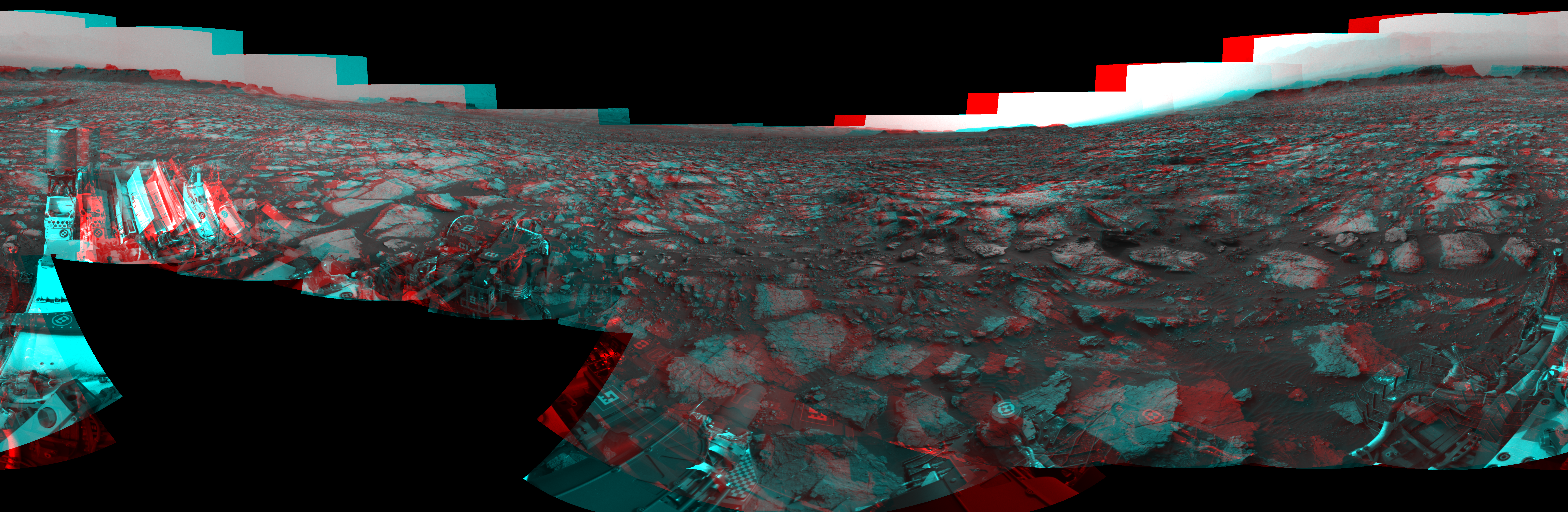 NASA's Mars rover Curiosity took 19 image pairs in Gale Crater using its mast-mounted Navigation Camera (Navcam) to create this mosaic. The seam-corrected mosaic provides a 360-degree cylindrical perspective projection panorama of the Martian surface suitable for stereo viewing, centered at 348 degrees azimuth (measured clockwise from north). This anaglyph must be viewed with red/blue glasses (red over left eye). Curiosity took the images on September 30, 2016, Sol 1475 of the Mars Science Laboratory mission at drive 912, site number 58. The local mean solar time for the image exposures was 3 PM. Each Navcam image has a 45-degree field of view. CREDIT: NASA/JPL-Caltech