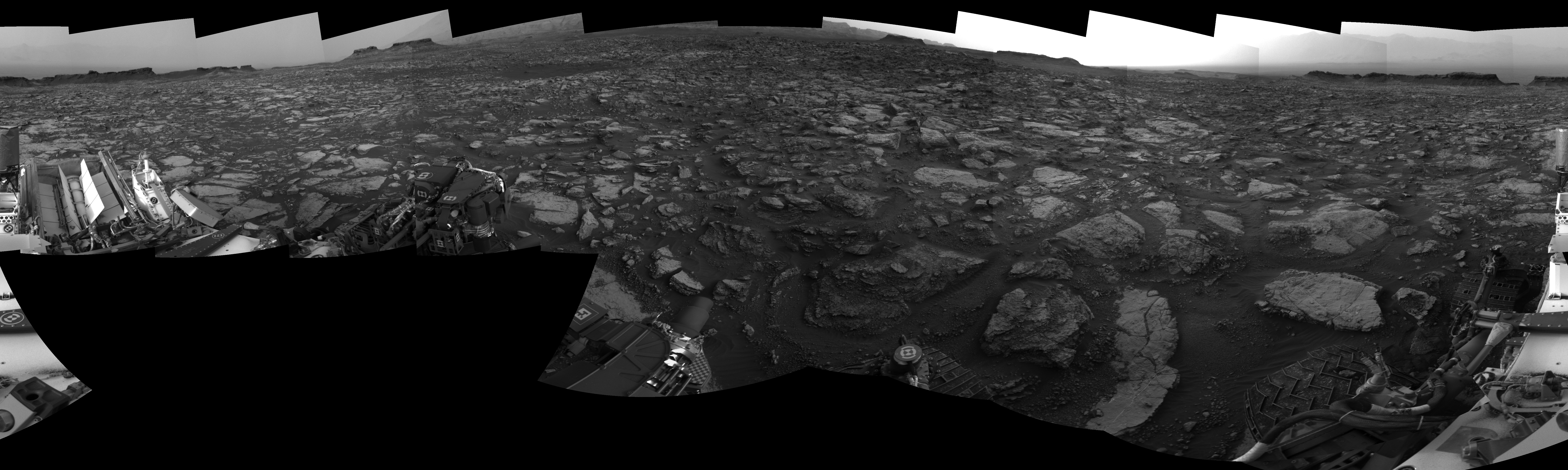 NASA's Mars rover Curiosity took 18 images in Gale Crater using its mast-mounted Right Navigation Camera (Navcam) to create this mosaic. The seam-corrected mosaic provides a 0-degree cylindrical-perspective projection panorama of the Martian surface suitable for stereo viewing, centered at 175 degrees azimuth (measured clockwise from north). This single-eye view must be combined with the partner left image to be viewed in stereo.  Curiosity took the images on October 05, 2016, Sol 1480 of the Mars Science Laboratory mission at drive 1248, site number 58. The local mean solar time for the image exposures was 4 PM. Each Navcam image has a 45-degree field of view. CREDIT: NASA/JPL-Caltech