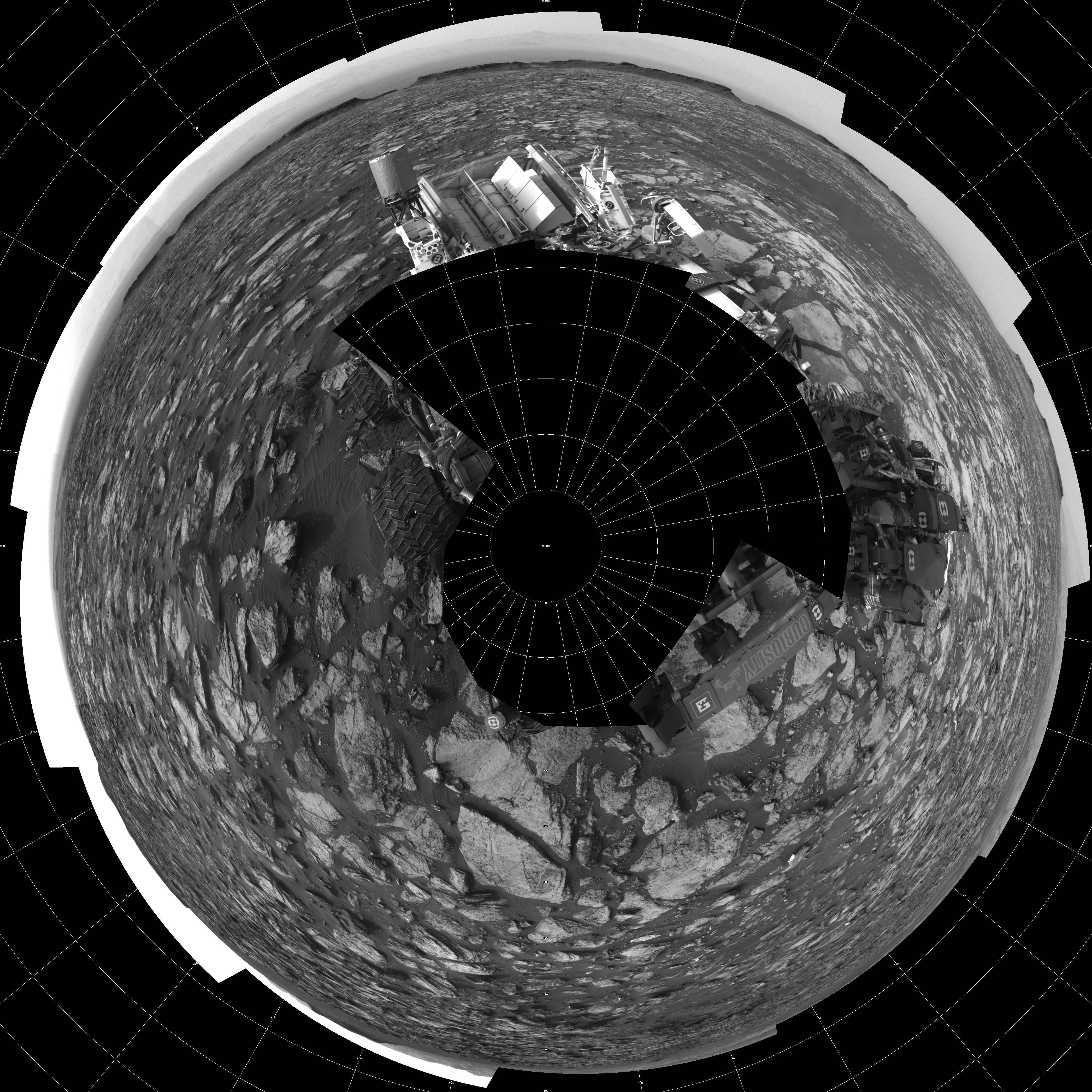 NASA's Mars rover Curiosity took 18 images in Gale Crater using its mast-mounted Left Navigation Camera (Navcam) to create this mosaic. The seam-corrected mosaic provides a polar stereographic projection panorama of the Martian surface with 0 degrees azimuth (measured clockwise from north) at the top of the image. Curiosity took the images on October 07, 2016, Sols 1482-1483 of the Mars Science Laboratory mission at drive 1572, site number 58. The local mean solar time for the image exposures was from 2 PM to 4 PM. Each Navcam image has a 45-degree field of view. CREDIT: NASA/JPL-Caltech