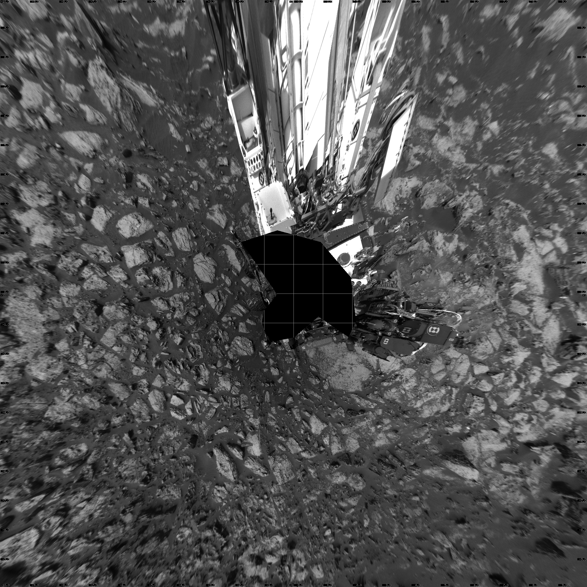 NASA's Mars rover Curiosity took 19 images in Gale Crater using its mast-mounted Left Navigation Camera (Navcam) to create this mosaic. The seam-corrected mosaic provides a vertical projection of the Martian surface near the rover, covering an area of 20 meters (north/south) by 20 meters (east/west). North is up in the image. This projection provides an overhead view, but introduces distortion for items not on the surface, such as large rocks and the rover itself. Curiosity took the images on October 10, 2016, Sol 1485 of the Mars Science Laboratory mission at drive 1836, site number 58. The local mean solar time for the image exposures was 2 PM. Each Navcam image has a 45-degree field of view. CREDIT: NASA/JPL-Caltech