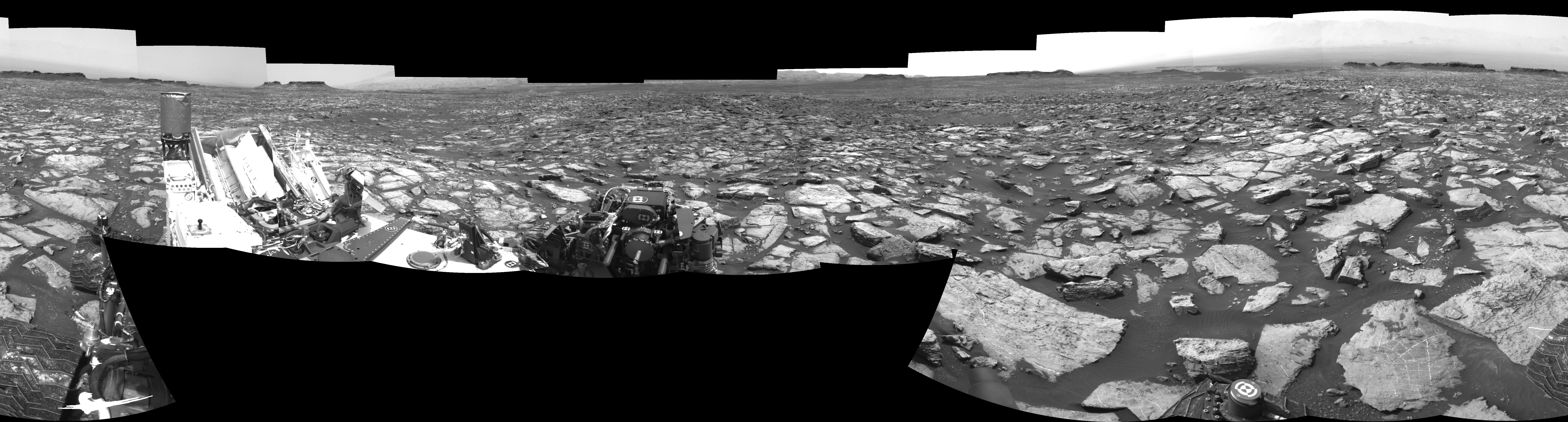 NASA's Mars rover Curiosity took 17 images in Gale Crater using its mast-mounted Left Navigation Camera (Navcam) to create this mosaic. The seam-corrected mosaic provides a 360-degree cylindrical-perspective projection panorama of the Martian surface suitable for stereo viewing, centered at 328 degrees azimuth (measured clockwise from north). This single-eye view must be combined with the partner right image to be viewed in stereo. Curiosity took the images on October 24, 2016, Sol 1499 of the Mars Science Laboratory mission at drive 2136, site number 58. The local mean solar time for the image exposures was 1 PM. Each Navcam image has a 45-degree field of view. CREDIT: NASA/JPL-Caltech