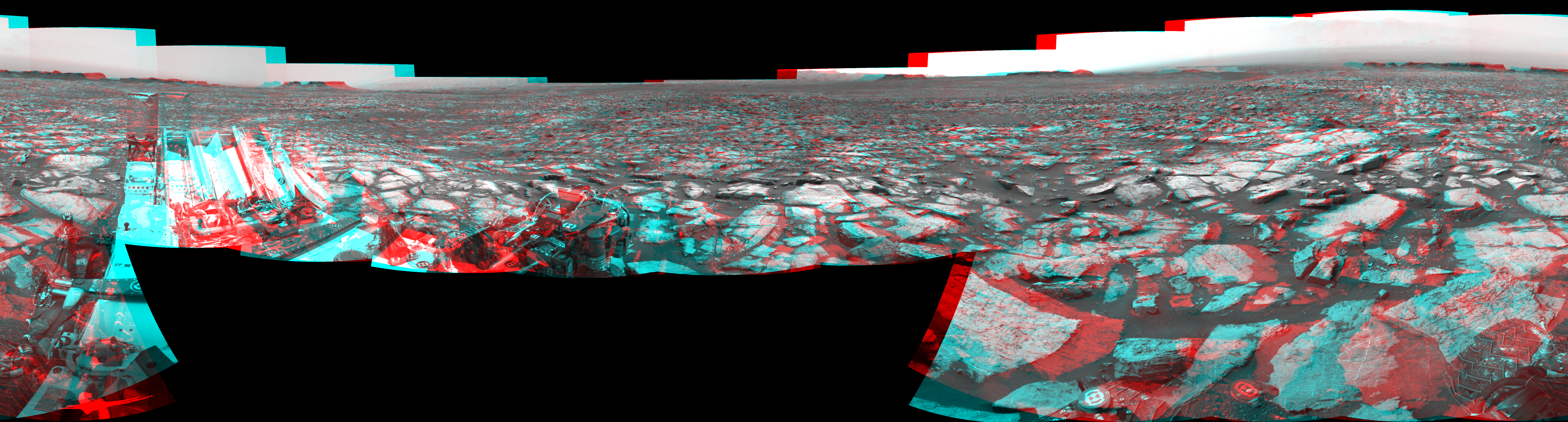 NASA's Mars rover Curiosity took 17 image pairs in Gale Crater using its mast-mounted Navigation Camera (Navcam) to create this mosaic. The seam-corrected mosaic provides a 360-degree cylindrical perspective projection panorama of the Martian surface suitable for stereo viewing, centered at 328 degrees azimuth (measured clockwise from north). This anaglyph must be viewed with red/blue glasses (red over left eye). Curiosity took the images on October 24, 2016, Sol 1499 of the Mars Science Laboratory mission at drive 2136, site number 58. The local mean solar time for the image exposures was 1 PM. Each Navcam image has a 45-degree field of view. CREDIT: NASA/JPL-Caltech
