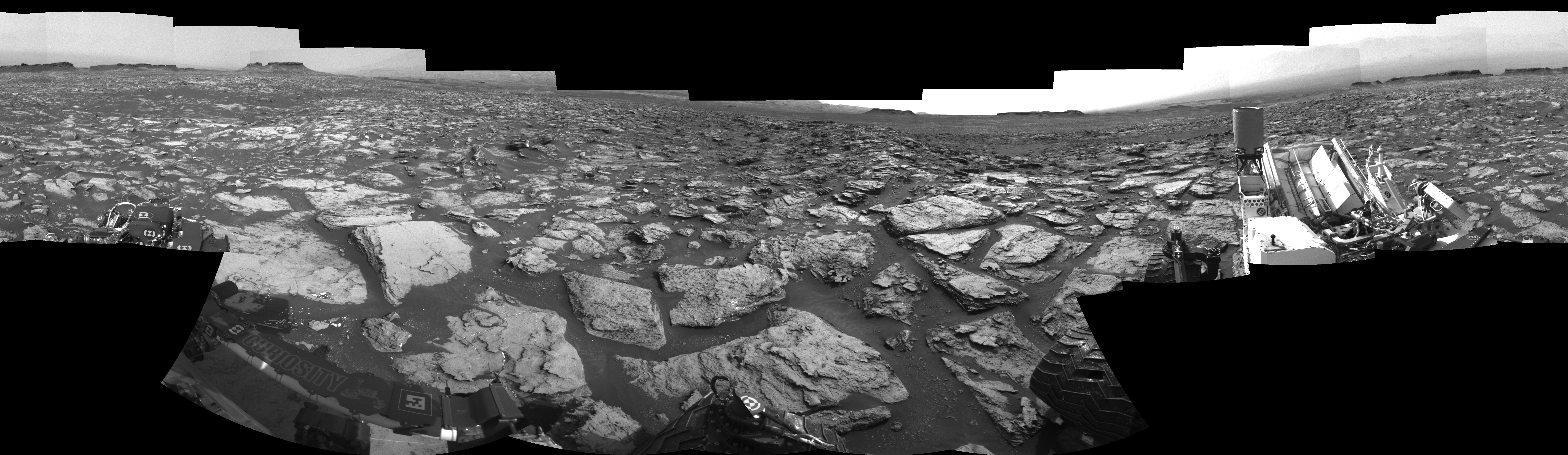 NASA's Mars rover Curiosity took 17 images in Gale Crater using its mast-mounted Left Navigation Camera (Navcam) to create this mosaic. The seam-corrected mosaic provides a 360-degree cylindrical-perspective projection panorama of the Martian surface suitable for stereo viewing, centered at 81 degrees azimuth (measured clockwise from north). This single-eye view must be combined with the partner right image to be viewed in stereo. Curiosity took the images on October 25, 2016, Sol 1500 of the Mars Science Laboratory mission at drive 2394, site number 58. The local mean solar time for the image exposures was 2 PM. Each Navcam image has a 45-degree field of view. CREDIT: NASA/JPL-Caltech
