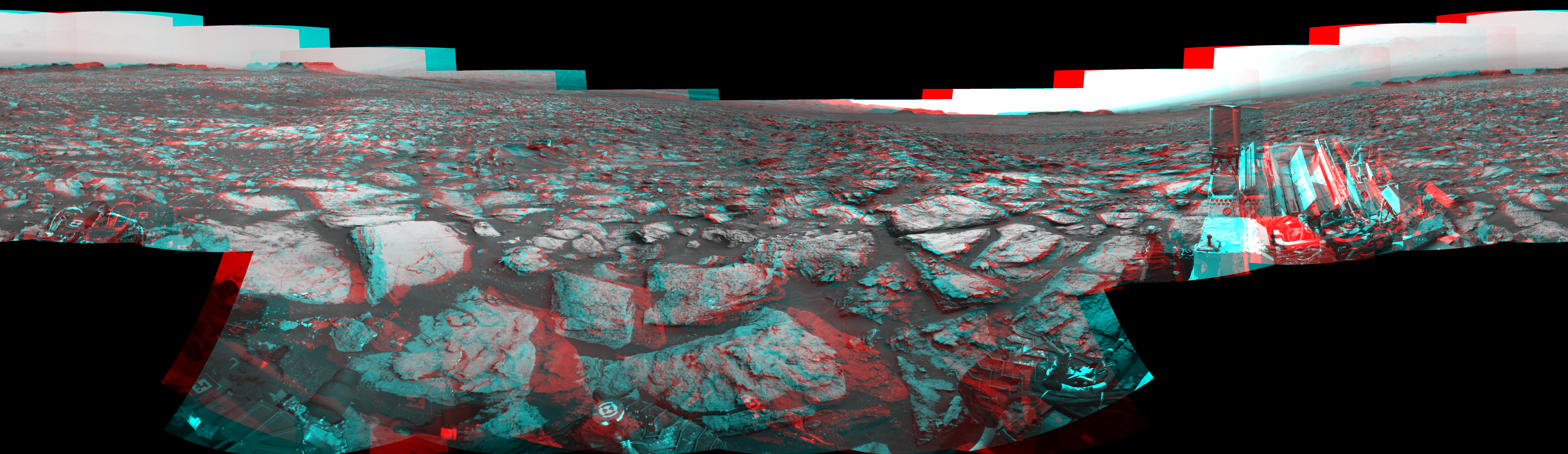 NASA's Mars rover Curiosity took 17 image pairs in Gale Crater using its mast-mounted Navigation Camera (Navcam) to create this mosaic. The seam-corrected mosaic provides a 360-degree cylindrical perspective projection panorama of the Martian surface suitable for stereo viewing, centered at 81 degrees azimuth (measured clockwise from north). This anaglyph must be viewed with red/blue glasses (red over left eye). Curiosity took the images on October 25, 2016, Sol 1500 of the Mars Science Laboratory mission at drive 2394, site number 58. The local mean solar time for the image exposures was 2 PM. Each Navcam image has a 45-degree field of view. CREDIT: NASA/JPL-Caltech